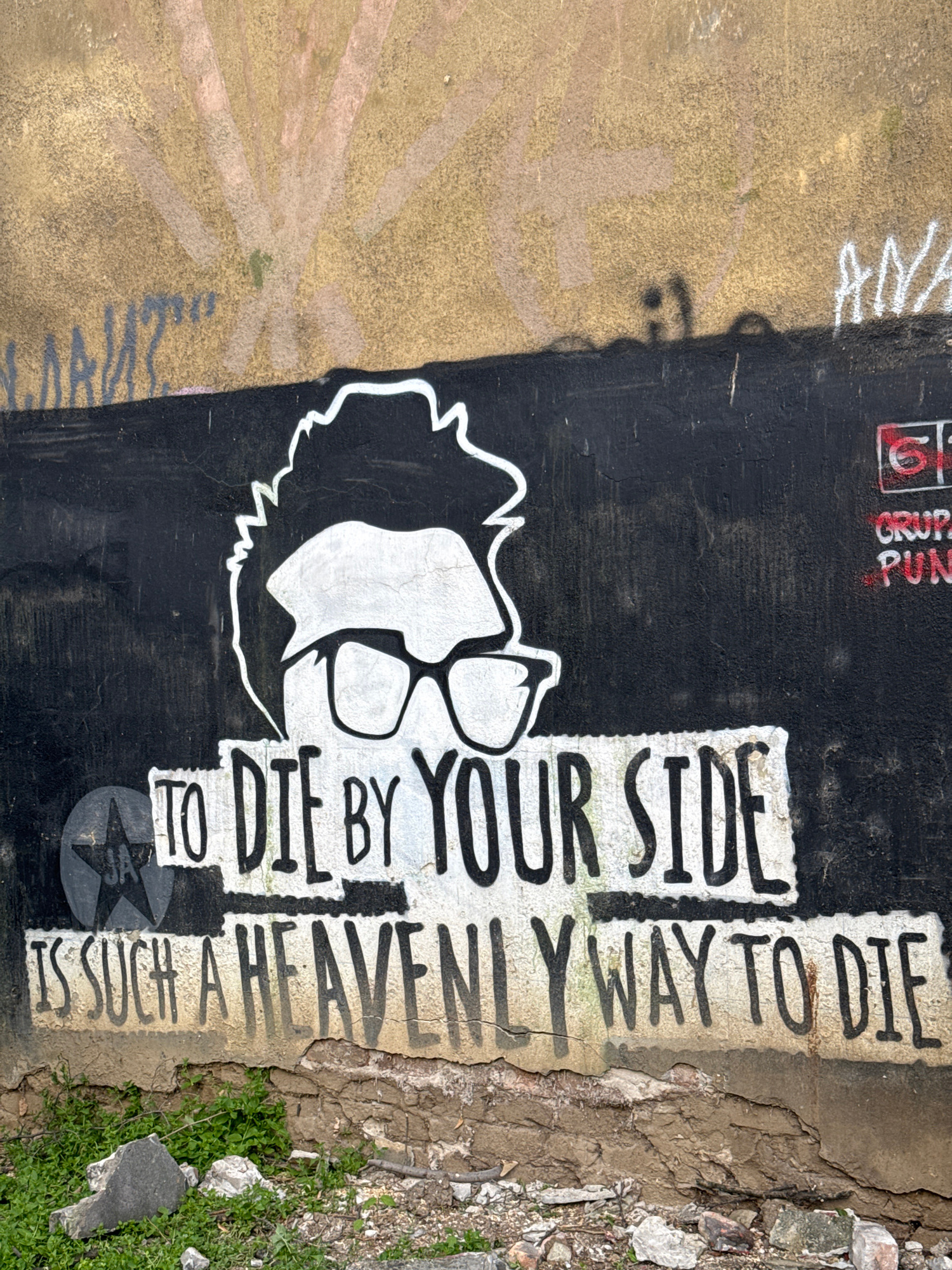 A close-up, slightly angled shot of graffiti art on a dark, weathered wall, possibly in Belgrade, Serbia. The artwork features a stylized, white-outlined head with dark, rectangular glasses, positione…read more