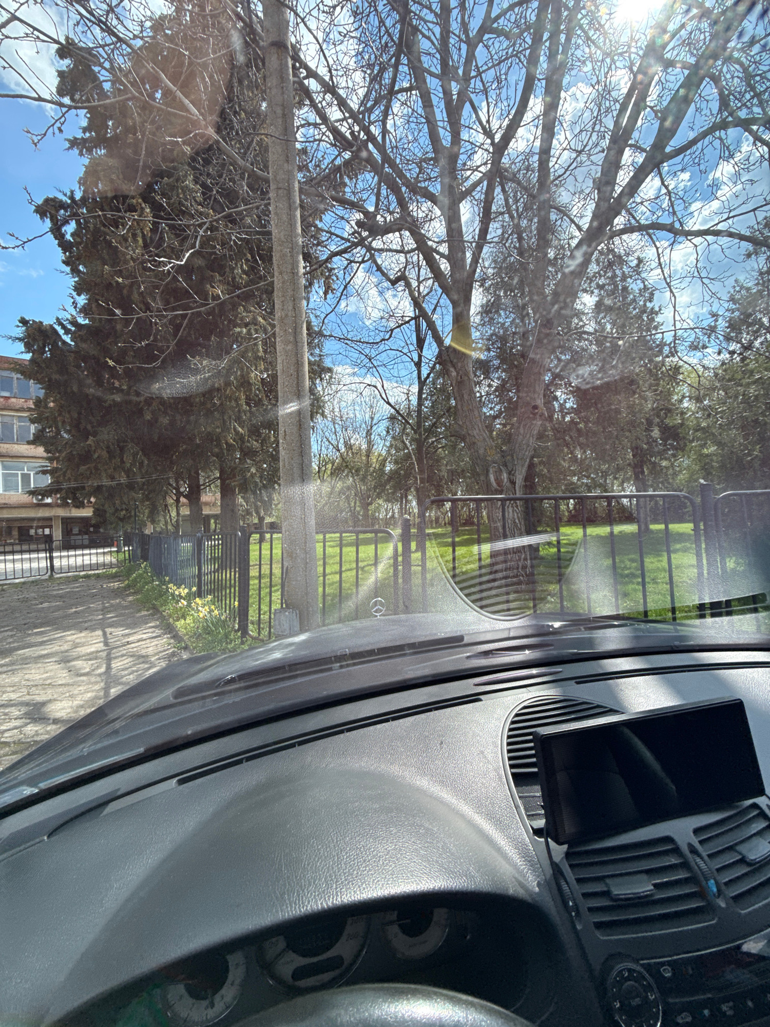 The view from inside a vehicle reveals an exterior scene. On the left, bare trees reach towards a sky dotted with clouds. Reflected in the windshield are the dashboard elements. Beyond the trees is a…read more