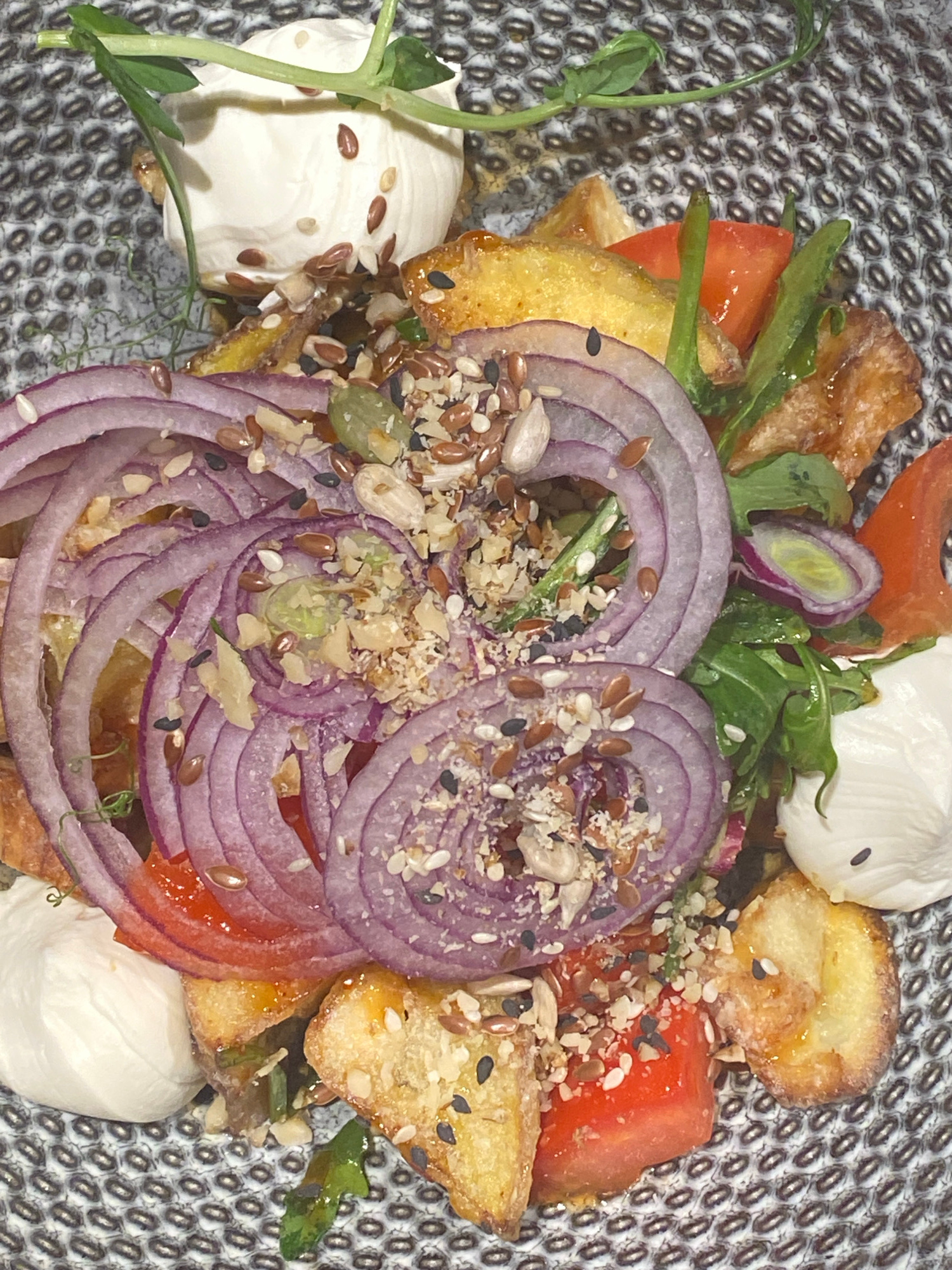 A close-up, overhead shot shows a plate of food. The main components are sliced red onions, chunks of fried potatoes, pieces of tomato, dollops of white creamy substance (likely a cheese or sauce), an…read more