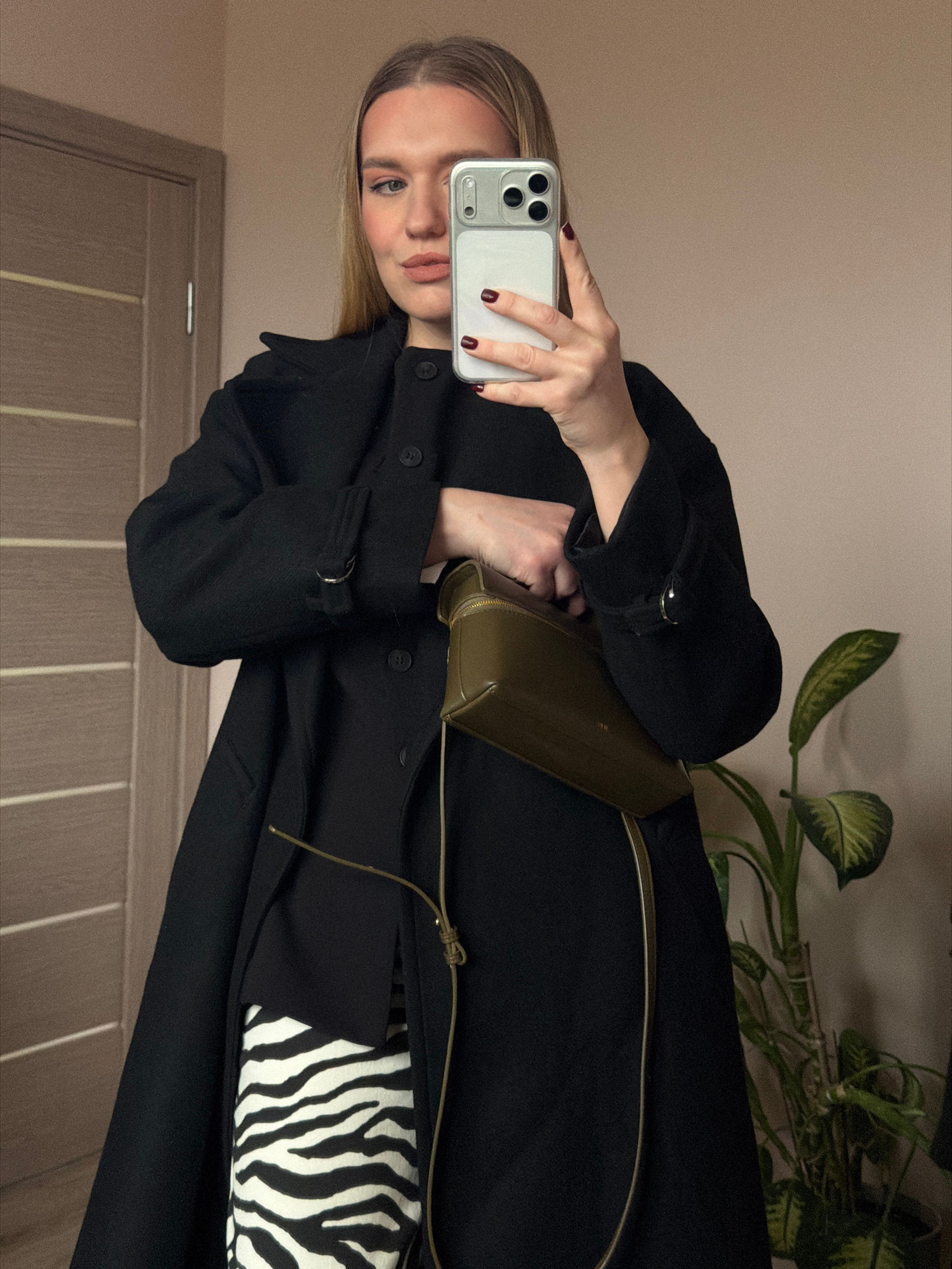 A fair-skinned woman with blonde hair is holding a white smartphone in her hands, seemingly taking a selfie. Her nails are painted a dark red. She is wearing a black overcoat and a shoulder bag of a m…read more