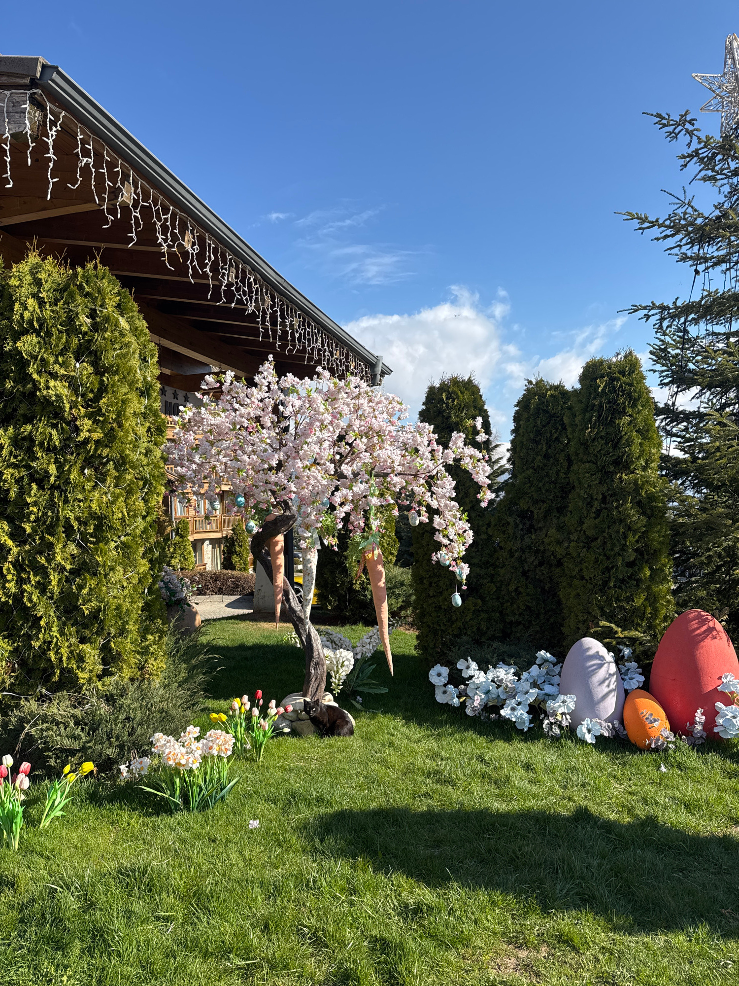 The image presents a springtime scene in what appears to be a yard or garden in Razlog, Bulgaria. The sky is blue with scattered clouds. A building is partially visible, featuring a pitched roof wit…read more