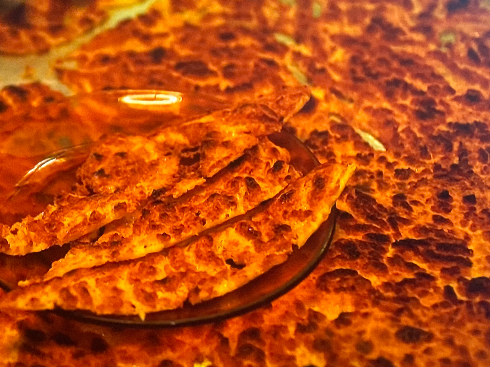 The image shows an arrangement of "crespells" or "cremadillos," a traditional pastry in Valencia, Spain, served on a glass plate. The pastries are thin, crisp, and browned, appearing freshly baked, si…read more