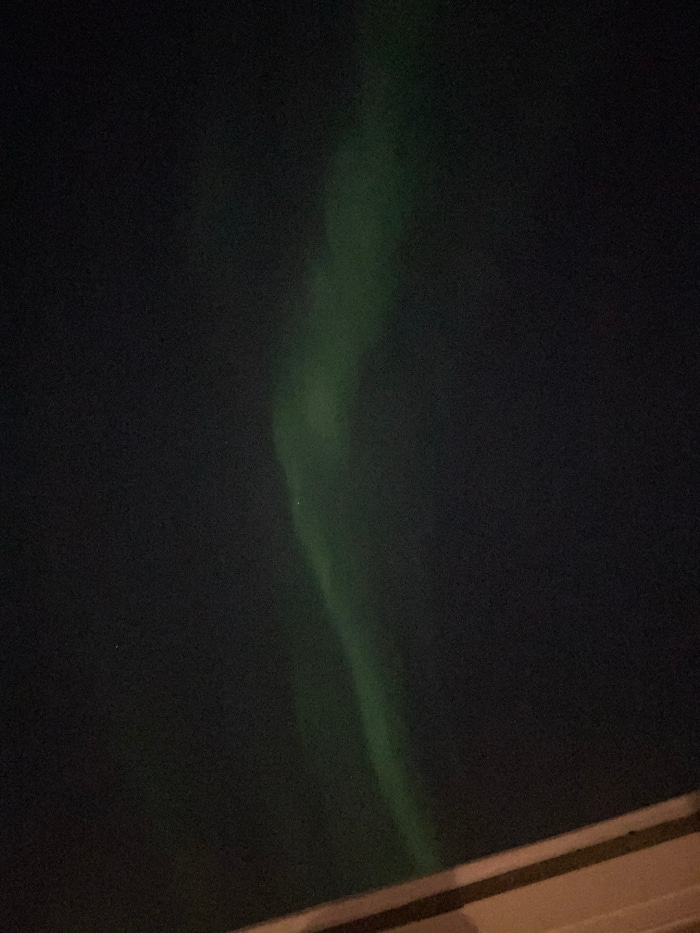 A dark night sky is illuminated by a faint, greenish aurora borealis stretching horizontally across the upper third of the frame. The aurora is diffuse, appearing as a wispy band with varying degrees…read more
