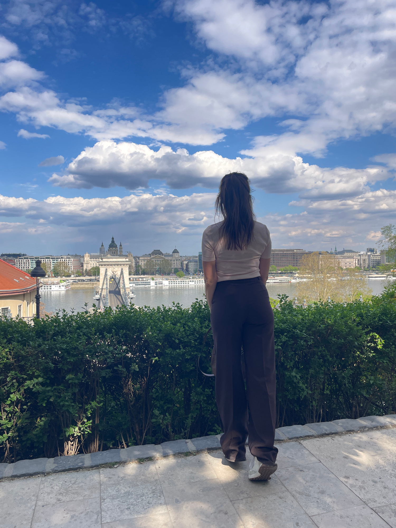 The image displays a full-body view of a person standing on a paved path, looking out over a panoramic cityscape with a river, identified as Budapest, Hungary. The perspective is from behind the indiv…read more
