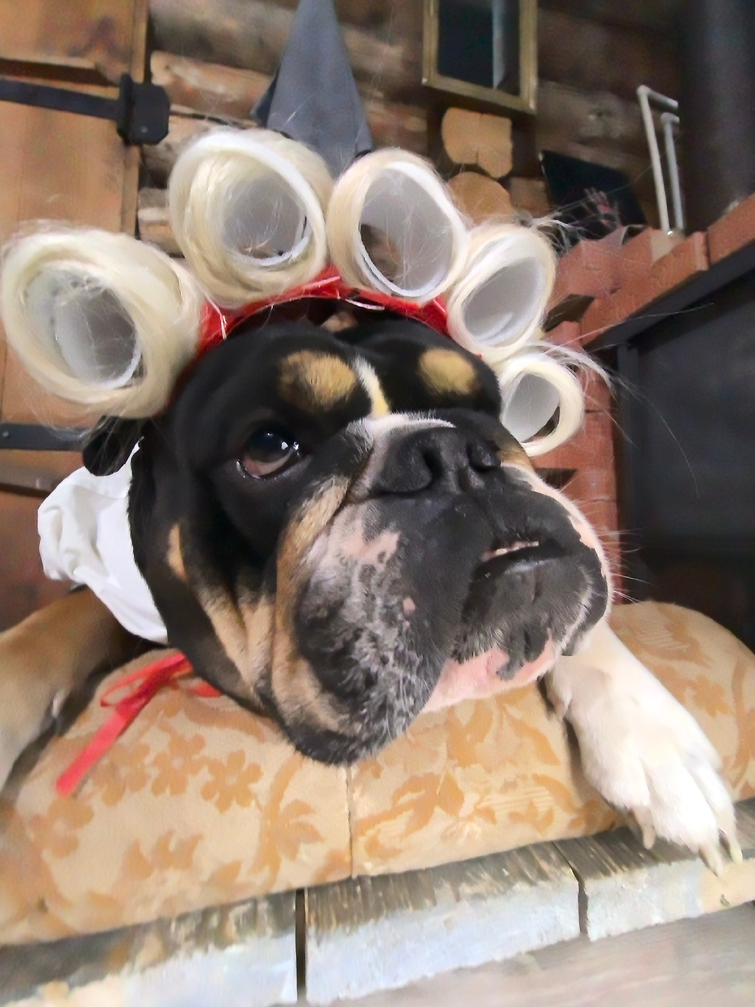 A close-up shot shows a bulldog adorned in a humorous costume, resting on a floral patterned pillow. The dog has a grey witch hat and six blonde curlers on its head, secured with a red headband. The d…read more