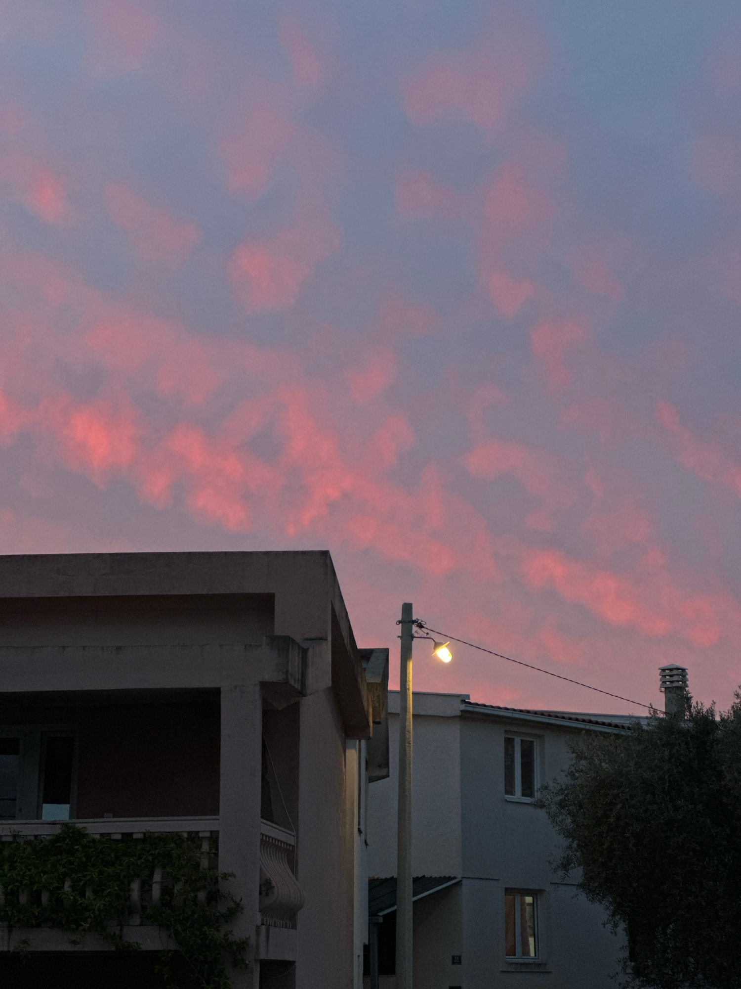 View of buildings and cloudy sky in Šušanj, Montenegro. A gray building with an open balcony and plants growing on it occupies the lower right corner. Above it is a second gray building with windows a…read more