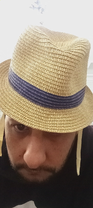 A person wearing a tan fedora with a blue stripe is partially visible. The hat is angled, obscuring much of their face. One eye is visible, along with a portion of their nose and cheek. The individual…read more
