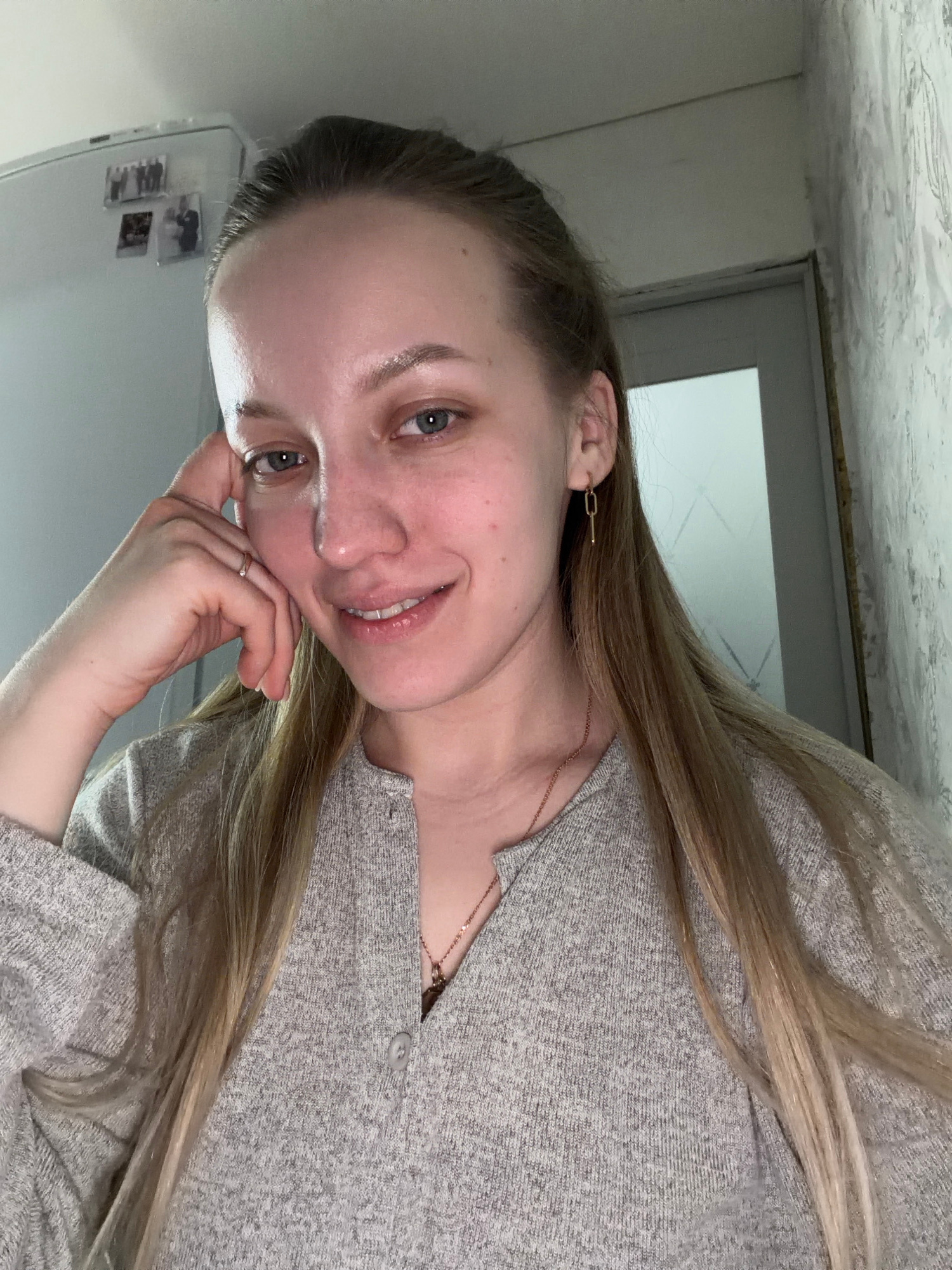 A young woman with blonde hair is smiling at the camera. She is wearing a gray sweater and gold jewelry. The background shows a white wall, a doorframe, and a white refrigerator with small photos atta…read more