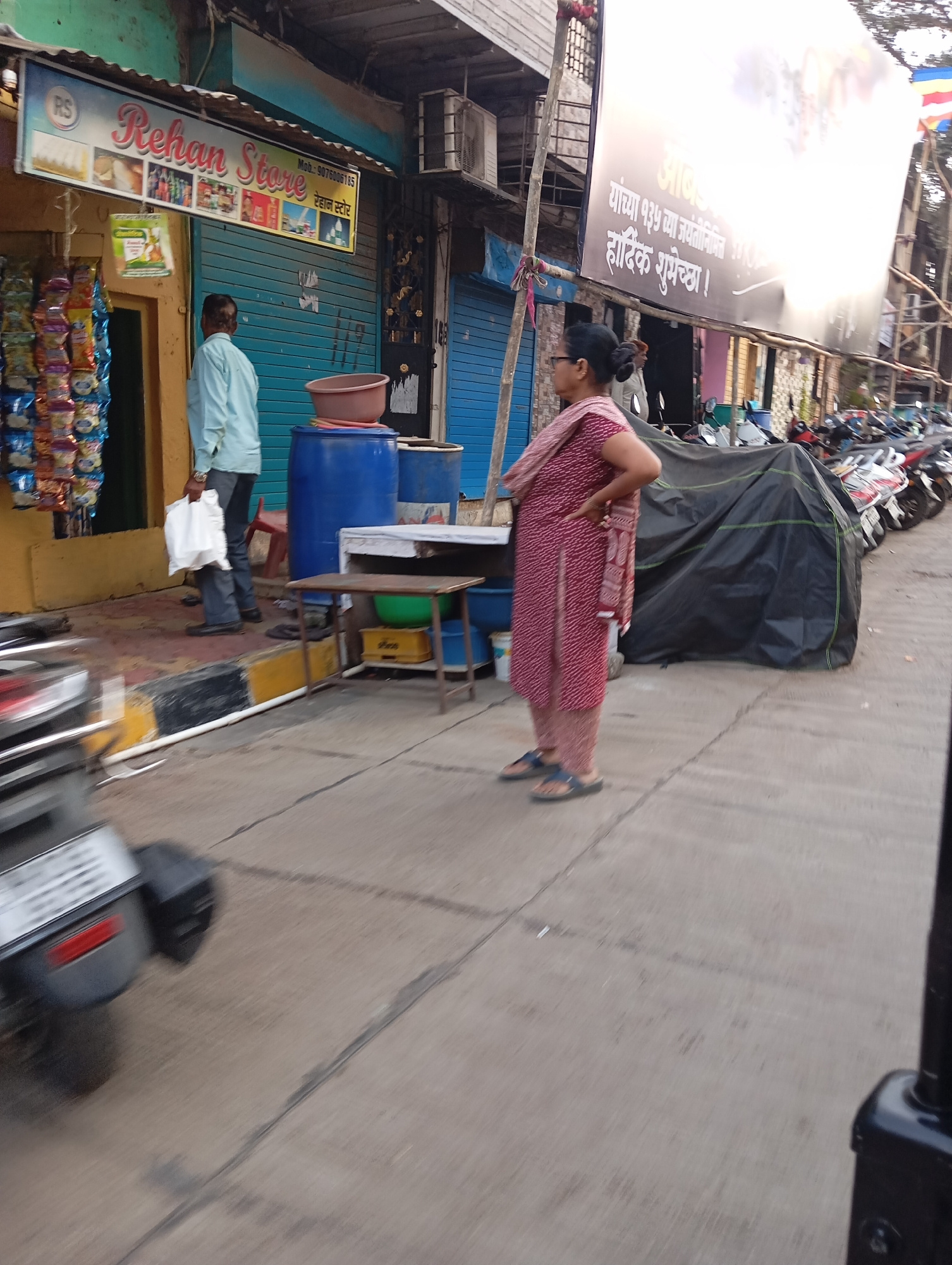 The image captures a street scene in Mumbai, India. A woman in a red and white patterned salwar kameez stands on the sidewalk, her hands casually on her hips. Behind her is a row of motorcycles covere…read more