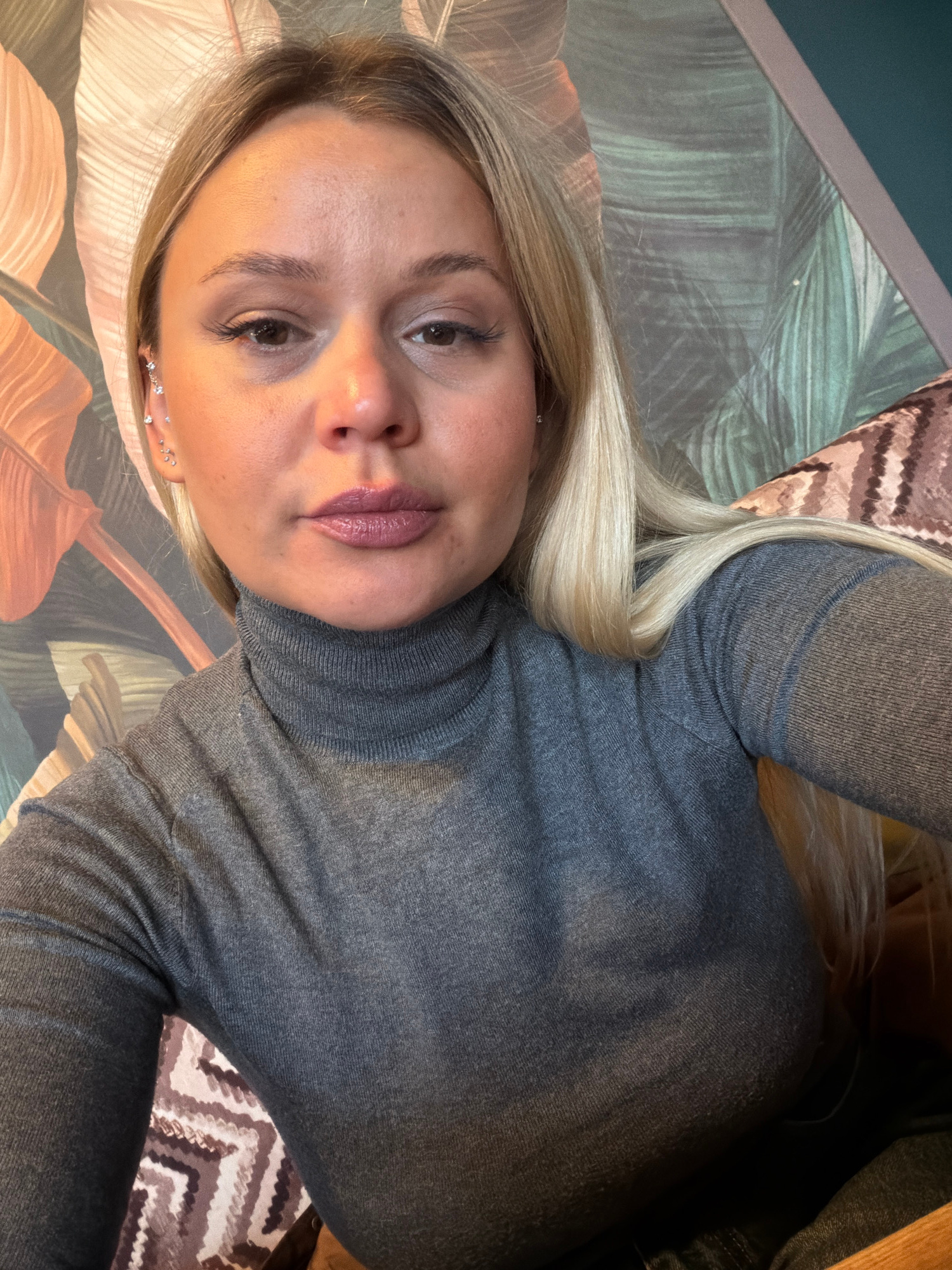 The image shows a blonde woman with a grey turtleneck sweater. She is close to the camera and is facing the viewer. The background includes a green and brown leafy design and a brown and white zigzag…read more