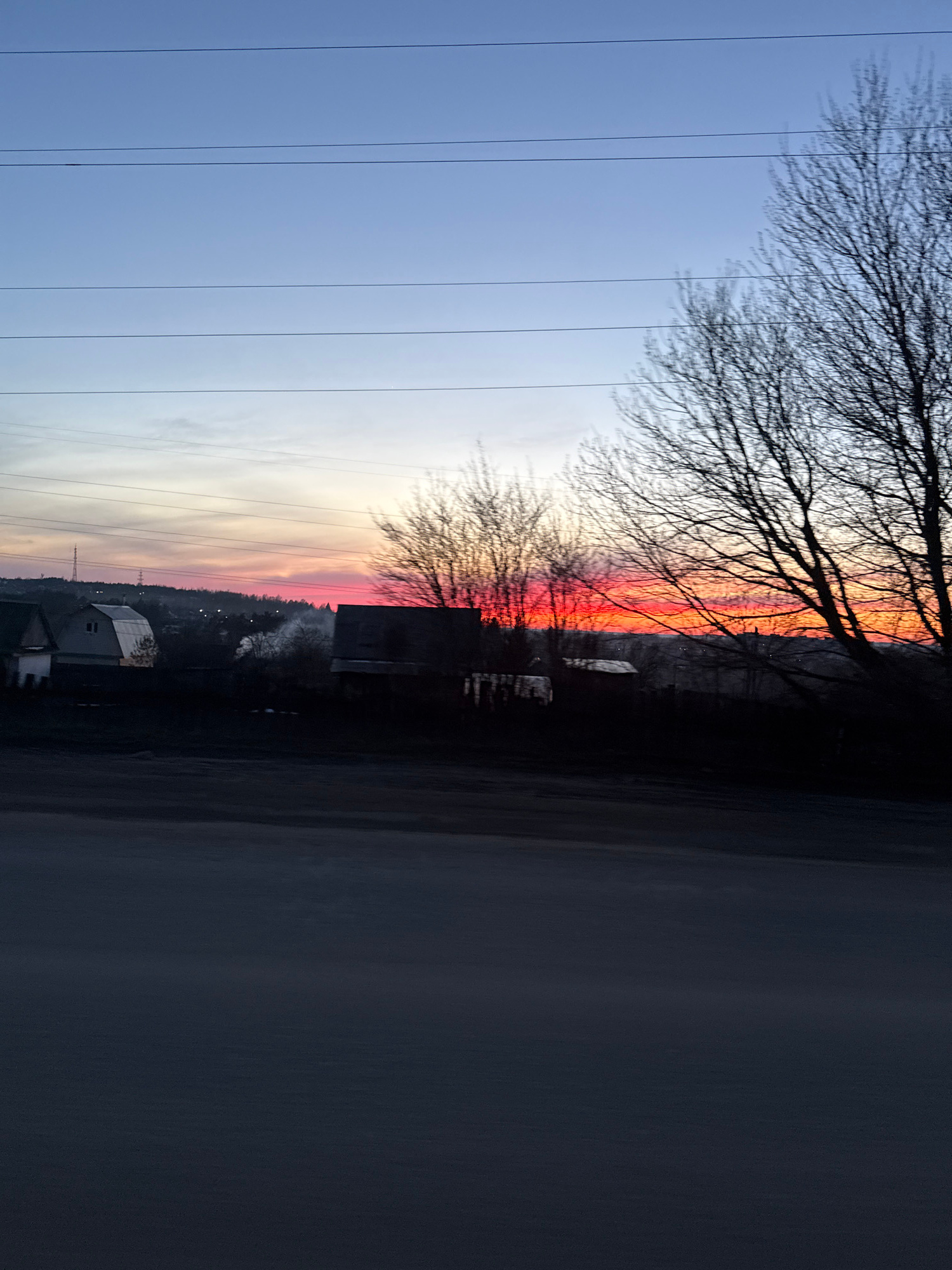 The image shows a sunset scene in what appears to be the outskirts of a town, possibly Chaikovsky, Russia. The sky exhibits a color gradient from a dark blue at the top, transitioning to orange and re…read more