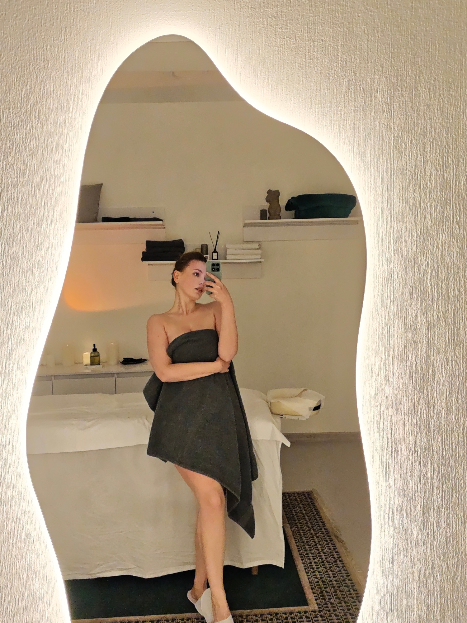 A woman wrapped in a gray towel stands in a room, as reflected in a uniquely shaped mirror with built-in lighting along its edges. The room appears to be a spa or treatment room, featuring a massage t…read more