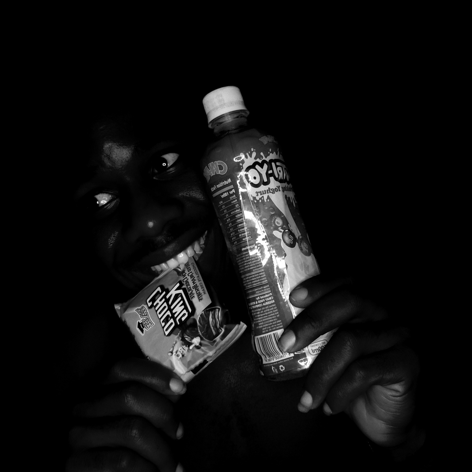 The image is a black and white photograph of a person lying on their back, holding a bottle of yogurt drink and a chocolate bar. The brand of yogurt drink is "Chudo Yogurt" and the chocolate bar is "K…read more