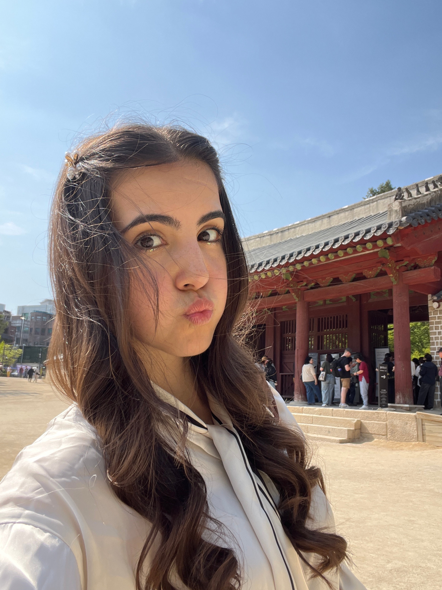 A young woman is taking a selfie in front of a traditional Korean building with a red and brown tiled roof. She has long, dark hair, brown eyes, and is wearing a white hooded jacket. She is making a k…read more