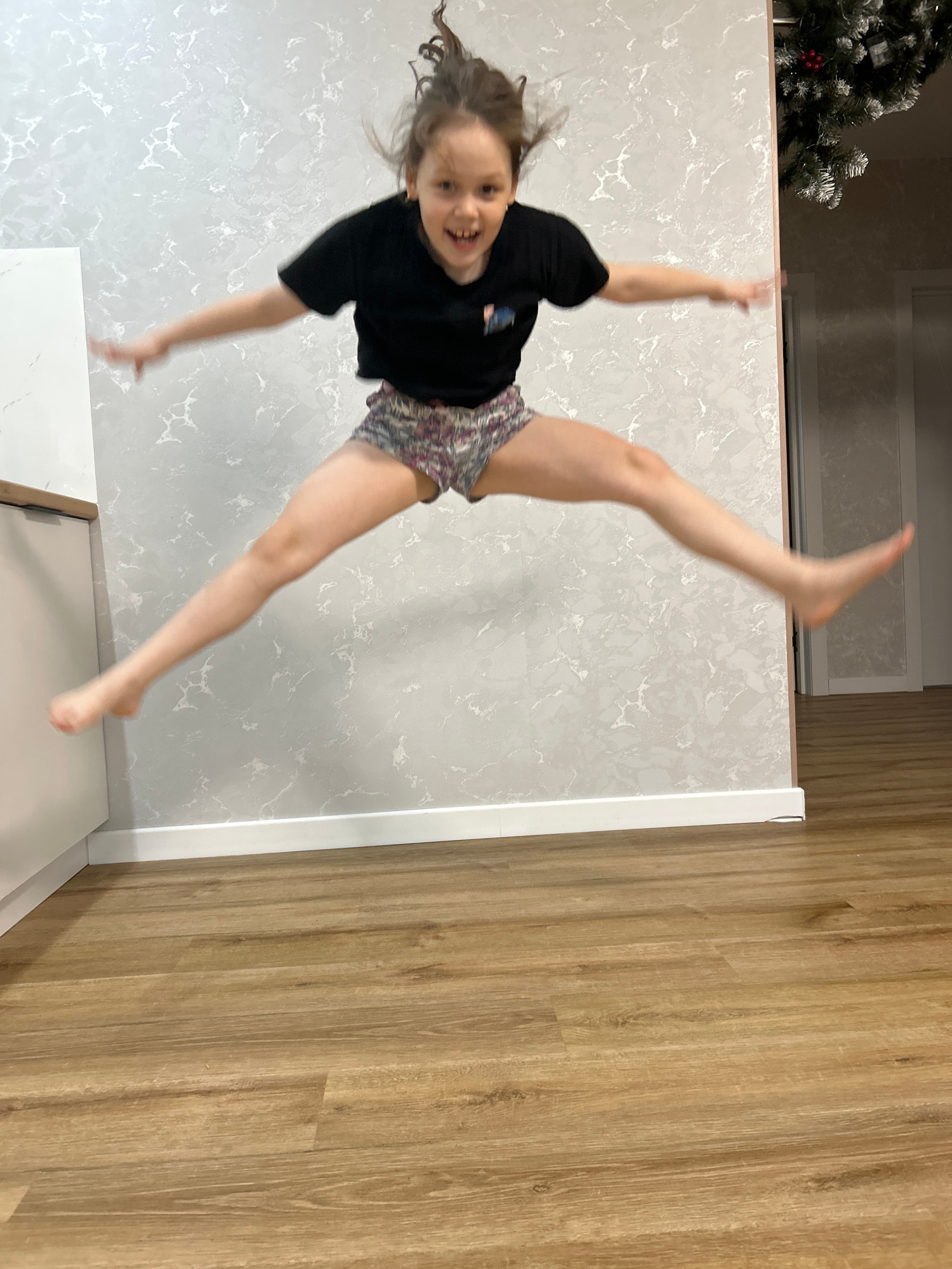 A young child is photographed mid-air. The child is wearing a black top and patterned shorts. The child's right leg is extended upward and slightly to the right, while the left leg is extended downwar…read more