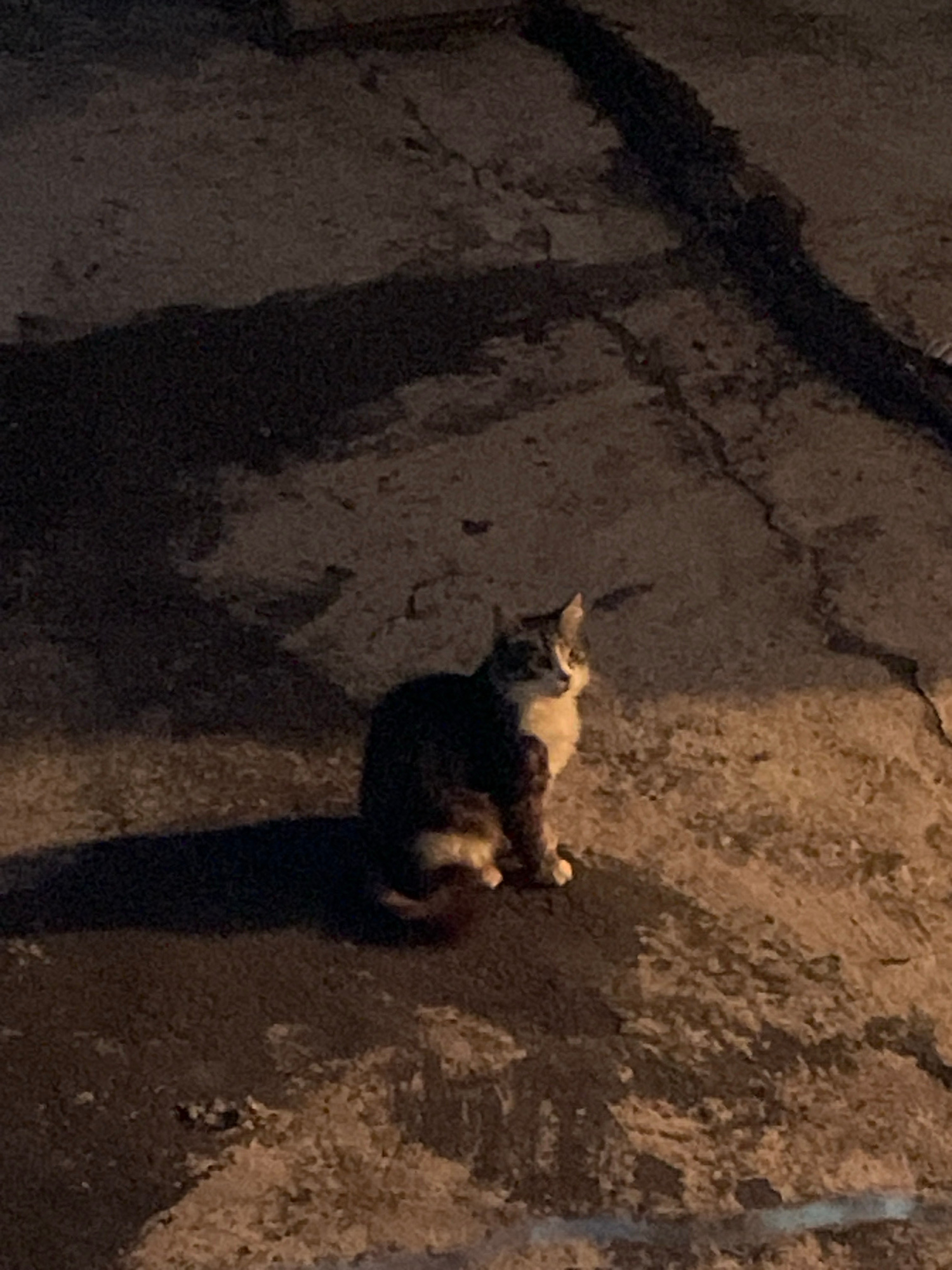 A black and white cat lies on a ledge or surface attached to a wall with a rough, textured surface. The scene is dimly lit, with shadows cast across the wall. The location is possibly Caracas, Venezue…read more