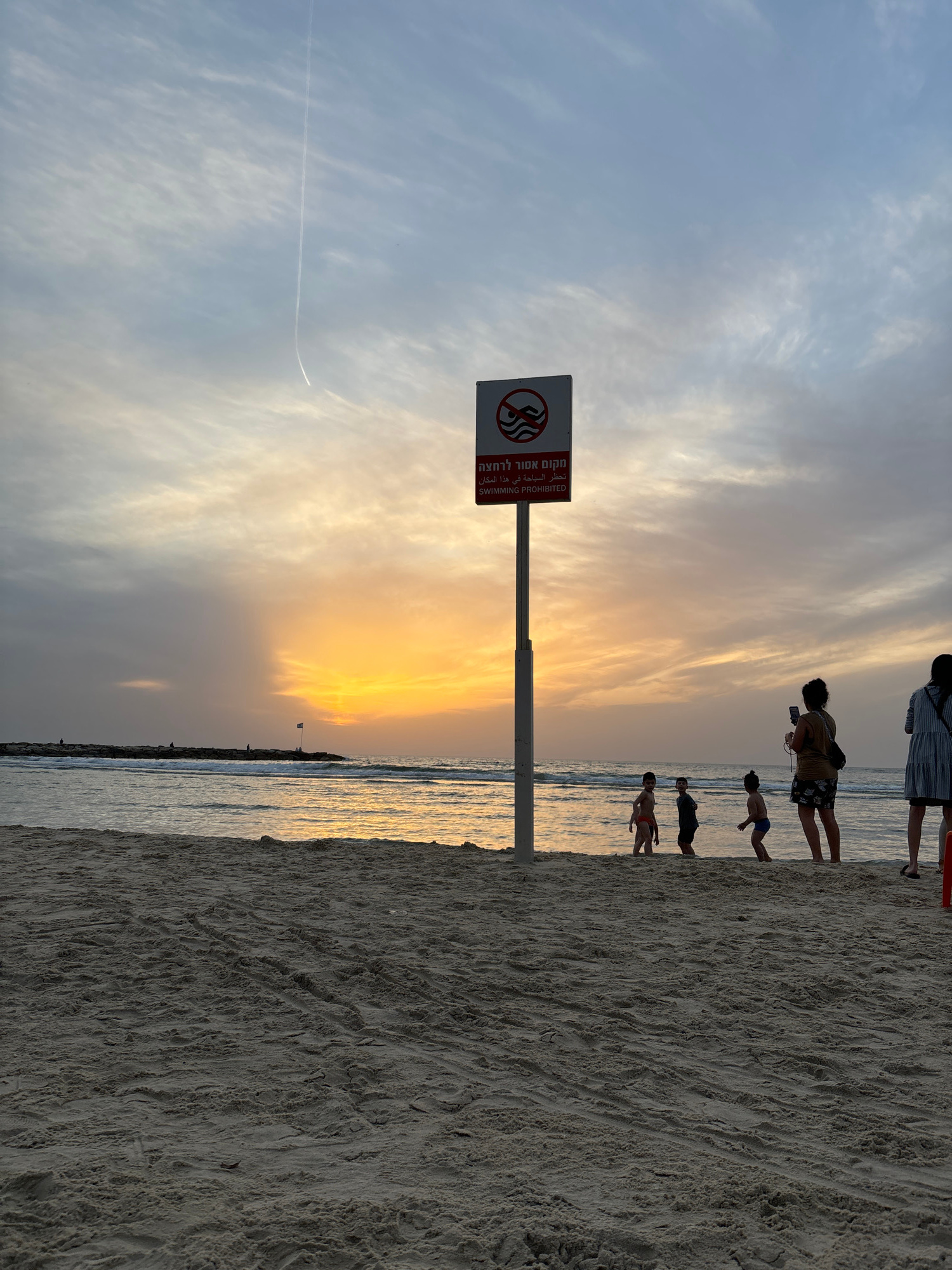The image depicts a beach scene at sunset, likely in Tel Aviv, Israel. The sky is a mix of light blue and orange hues. A no-swimming sign stands prominently in the foreground. Several people are seen…read more