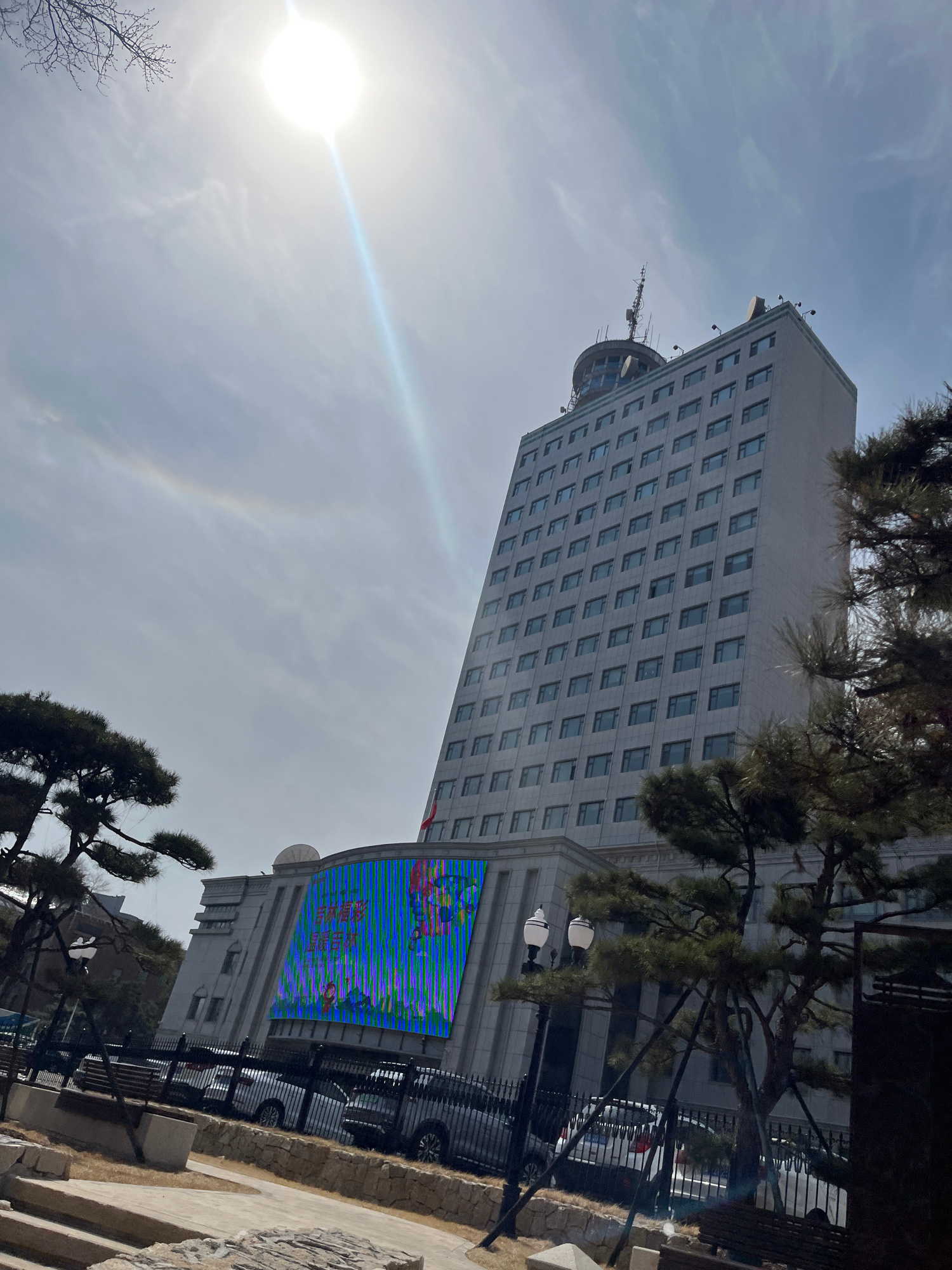 The image depicts a tall, rectangular building with a grid of windows, angled upward. The building has a circular structure on top with antennas. A large LED screen with colorful patterns is attached…read more
