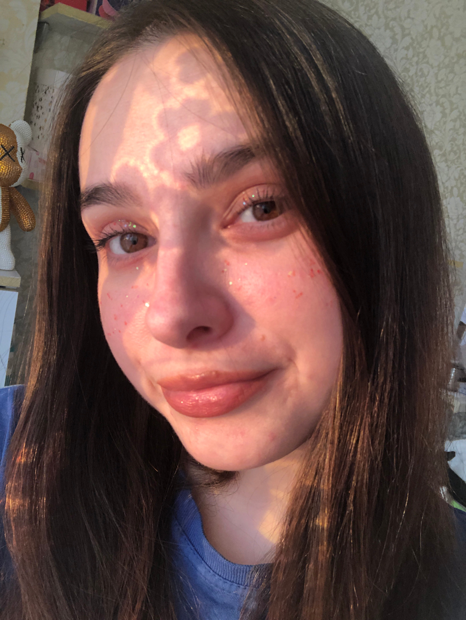 The image shows a close-up of a person's face. The person has fair skin, brown eyes, and dark brown hair. There are small red spots and possibly glitter or reflective particles on the face, particular…read more