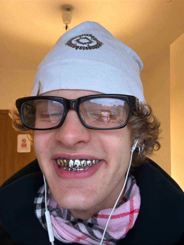 The image presents a chest-up portrait of a young individual captured indoors in Milan, Italy. The subject, with curly light brown hair, smiles broadly, displaying a prominent silver dental grill cove…read more