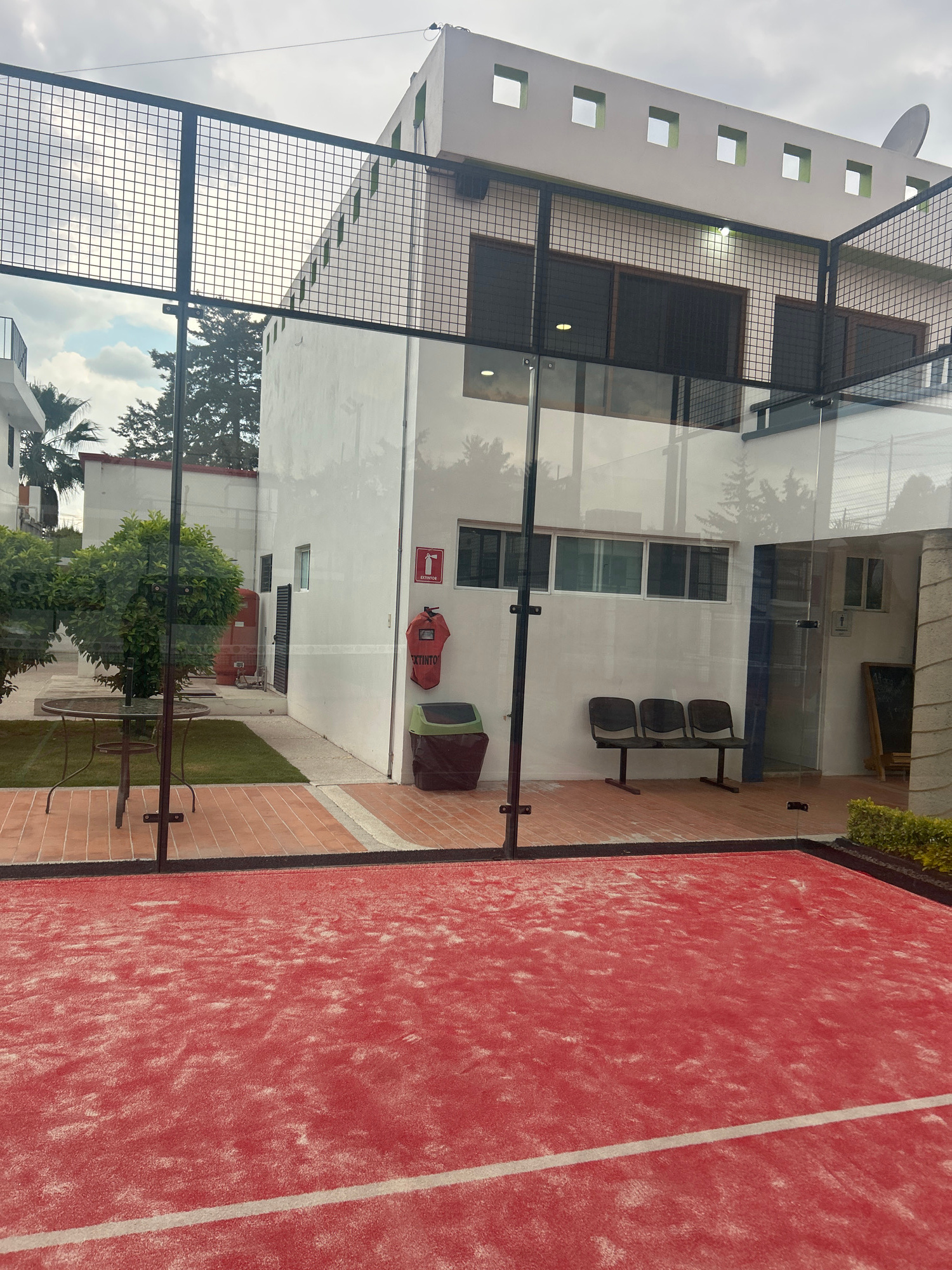 The image shows a paddle tennis court in Puebla, Mexico. The court is red with white lines. Adjacent to the court, there is a building with a white facade, metal mesh fencing, and glass panels. The bu…read more