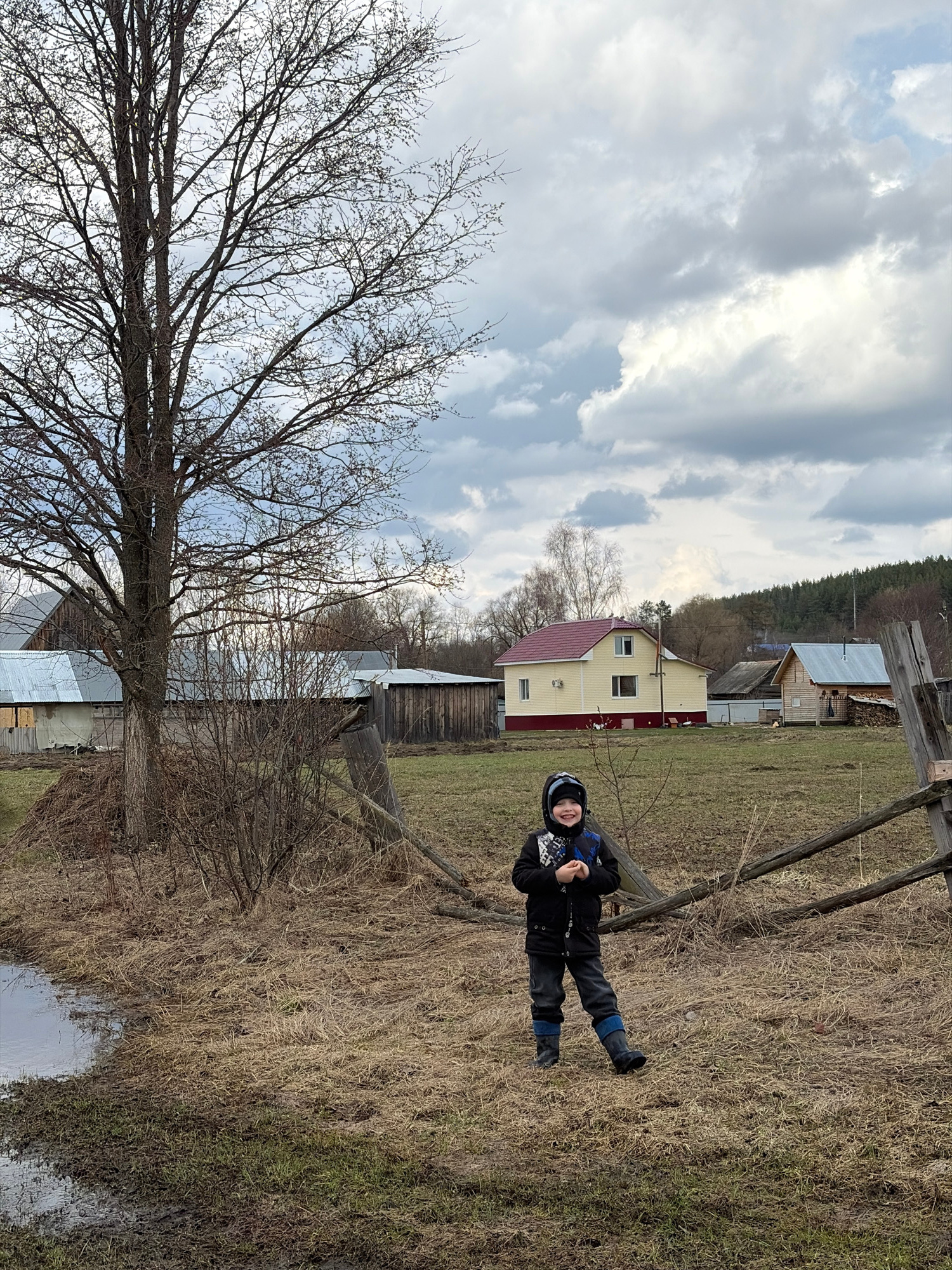 A color photograph, taken outdoors in the city of Кемуль, Russia, shows a young child in the foreground, wearing a dark jacket, dark pants, and a helmet. The child is positioned on a grassy area amids…read more