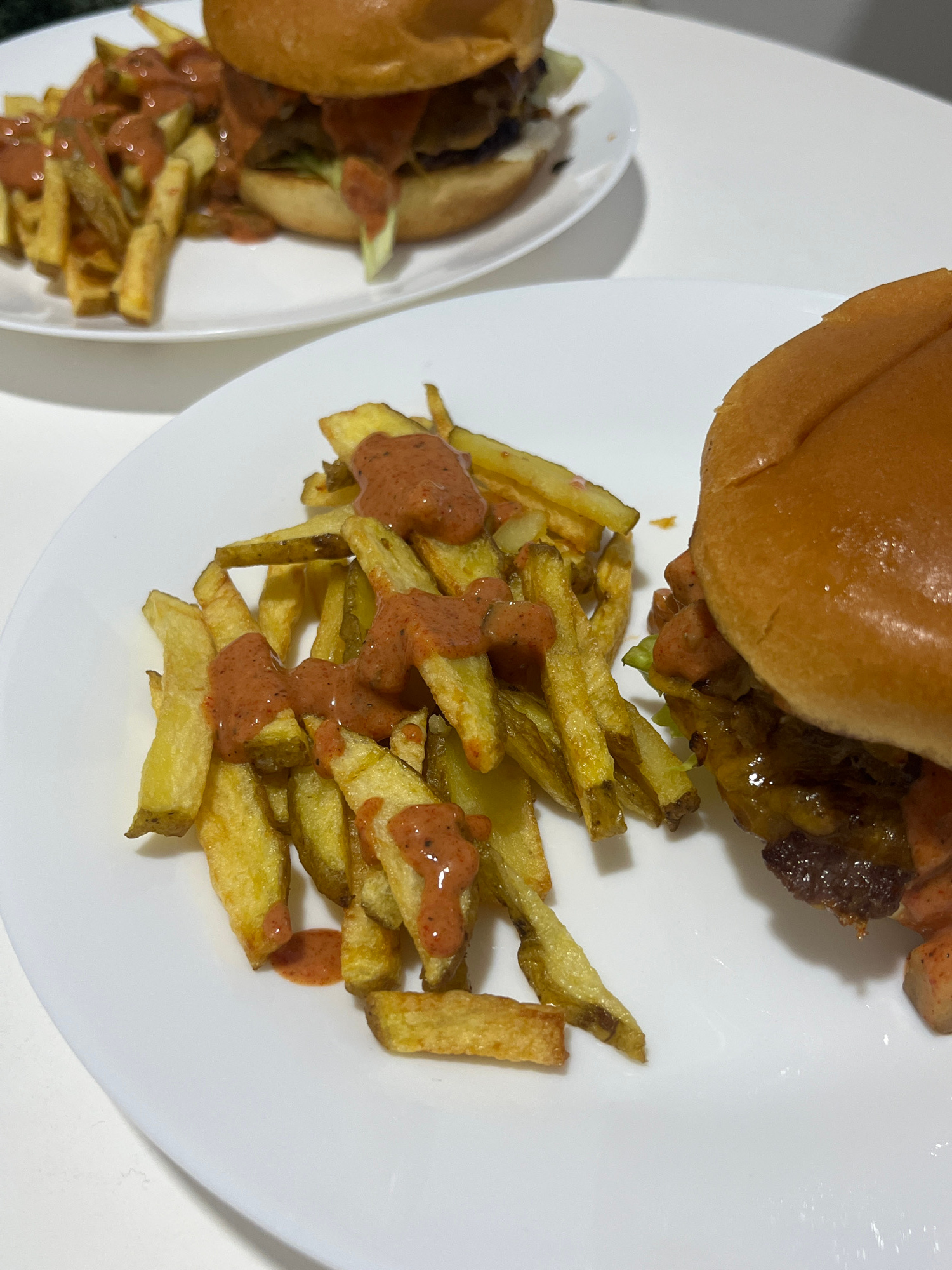 A high-angle shot displays two plates of food. Each plate contains a hamburger and a pile of French fries, both generously drizzled with a reddish-brown sauce. The plates are placed on a clean, white…read more