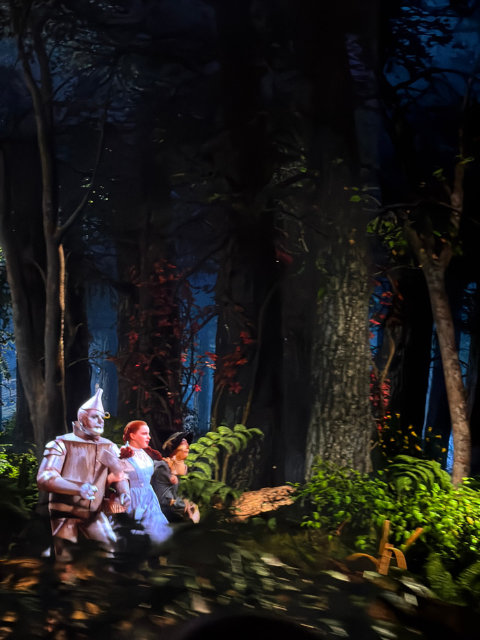 A blurry image shows figures from The Wizard of Oz, likely part of an animatronic display. The Tin Man is prominent in the foreground, rendered in a metallic, robotic form. Behind him lie Dorothy, the…read more