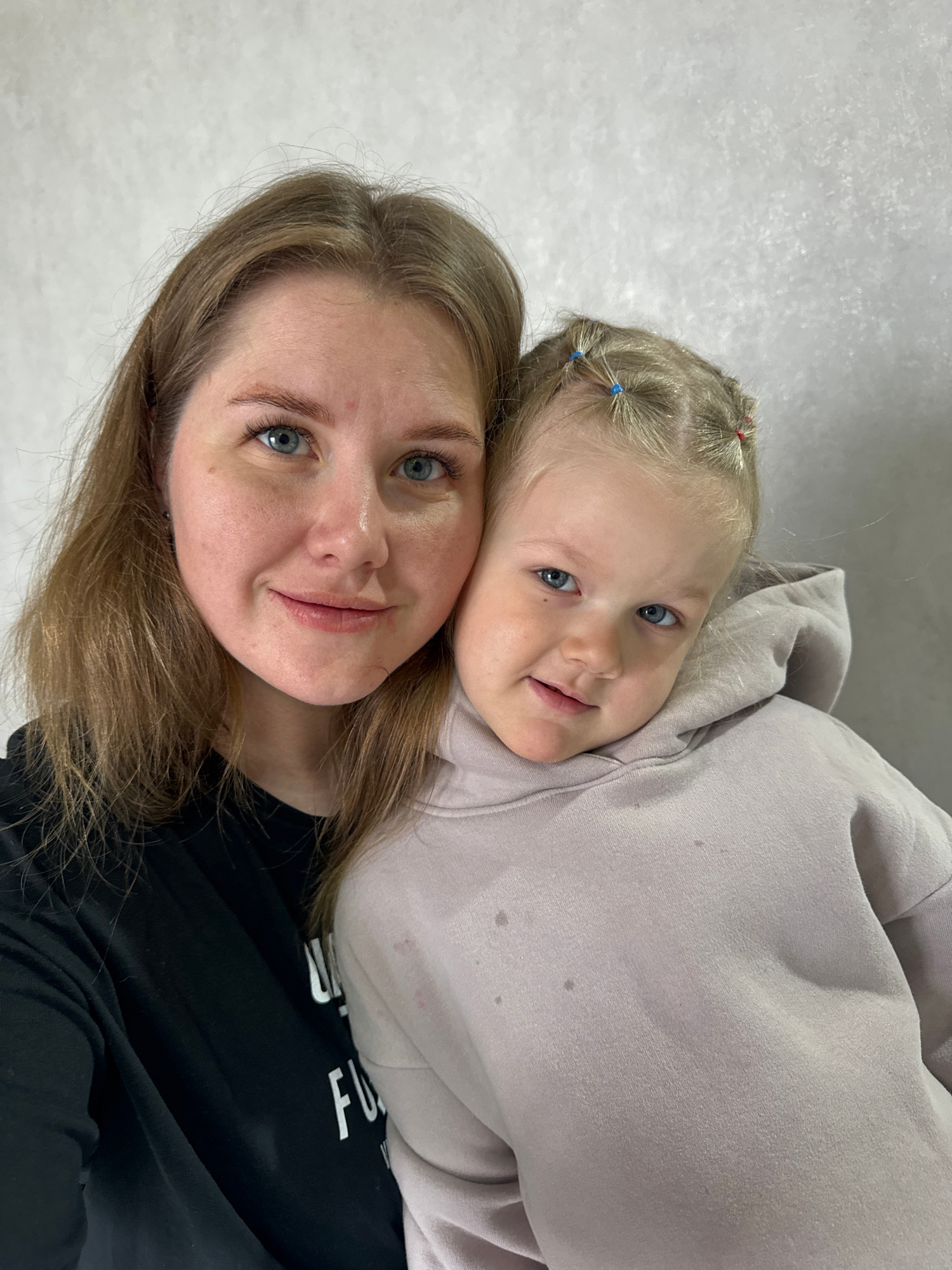 The image depicts a woman and a young child in close proximity. The woman has light brown hair and blue eyes and is wearing a black shirt. The child has blonde hair styled with colorful hair ties and…read more
