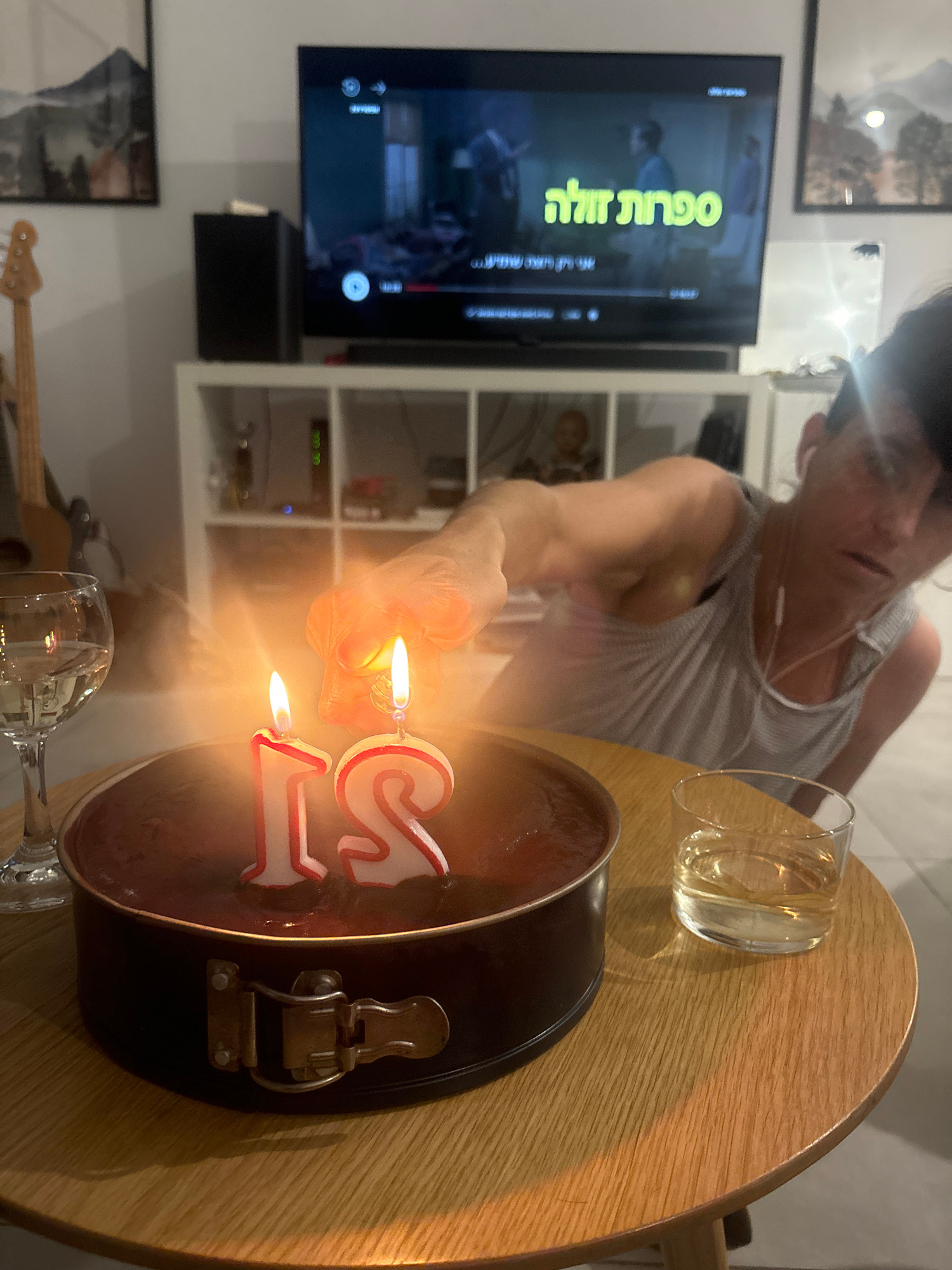 A person stands near a round wooden table in an indoor setting in Givatayim, Israel. The table holds a glass of liquid and a cake with "15" candles lit. The person holds a lighter near the candles. Be…read more