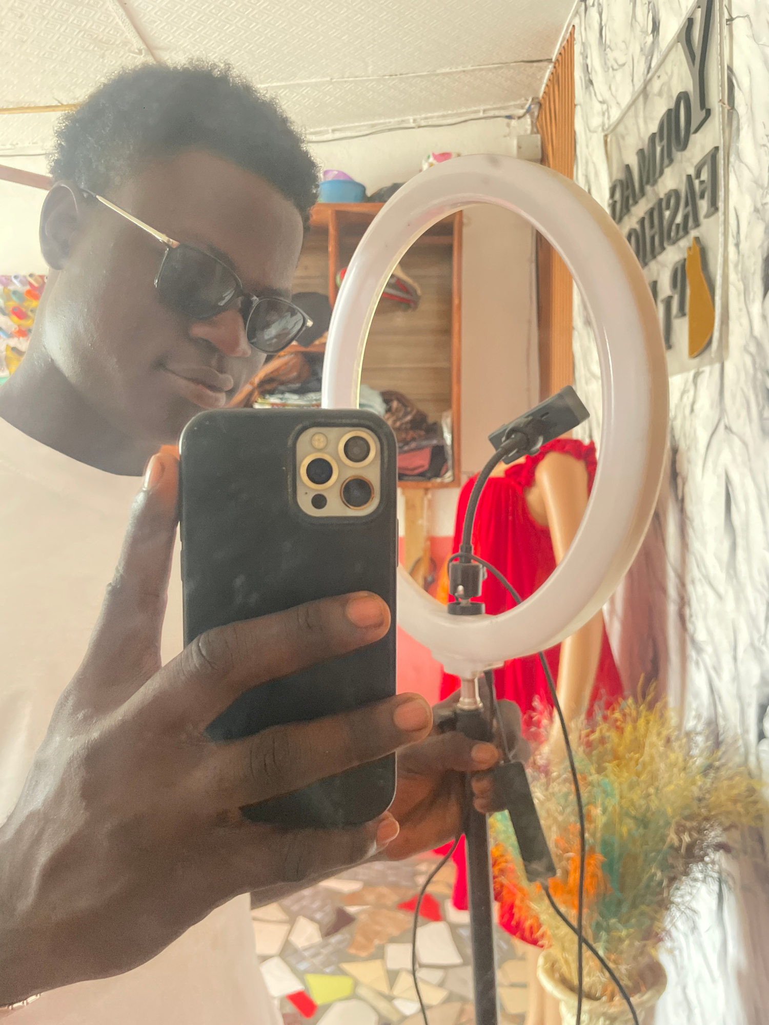 A person wearing sunglasses is holding a black iPhone in front of a ring light. The background includes items such as a mannequin head and decorative items attached to the wall. The image appears to h…read more