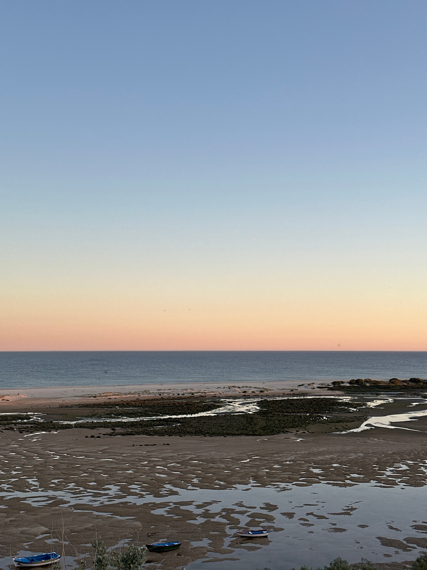 The image depicts a coastal scene at low tide. A wide expanse of wet sand is visible, reflecting the sky and creating mottled patterns. Two small boats are beached on the sand. A strip of vegetation r…read more