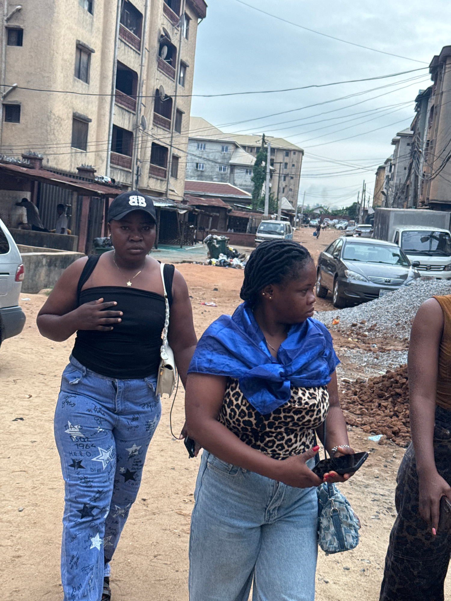 The image shows two Black women standing on a dirt street in Onitsha, Nigeria. The woman on the left wears a black tank top, blue jeans with star patterns, and a black baseball cap. She has a gold neβ¦read more