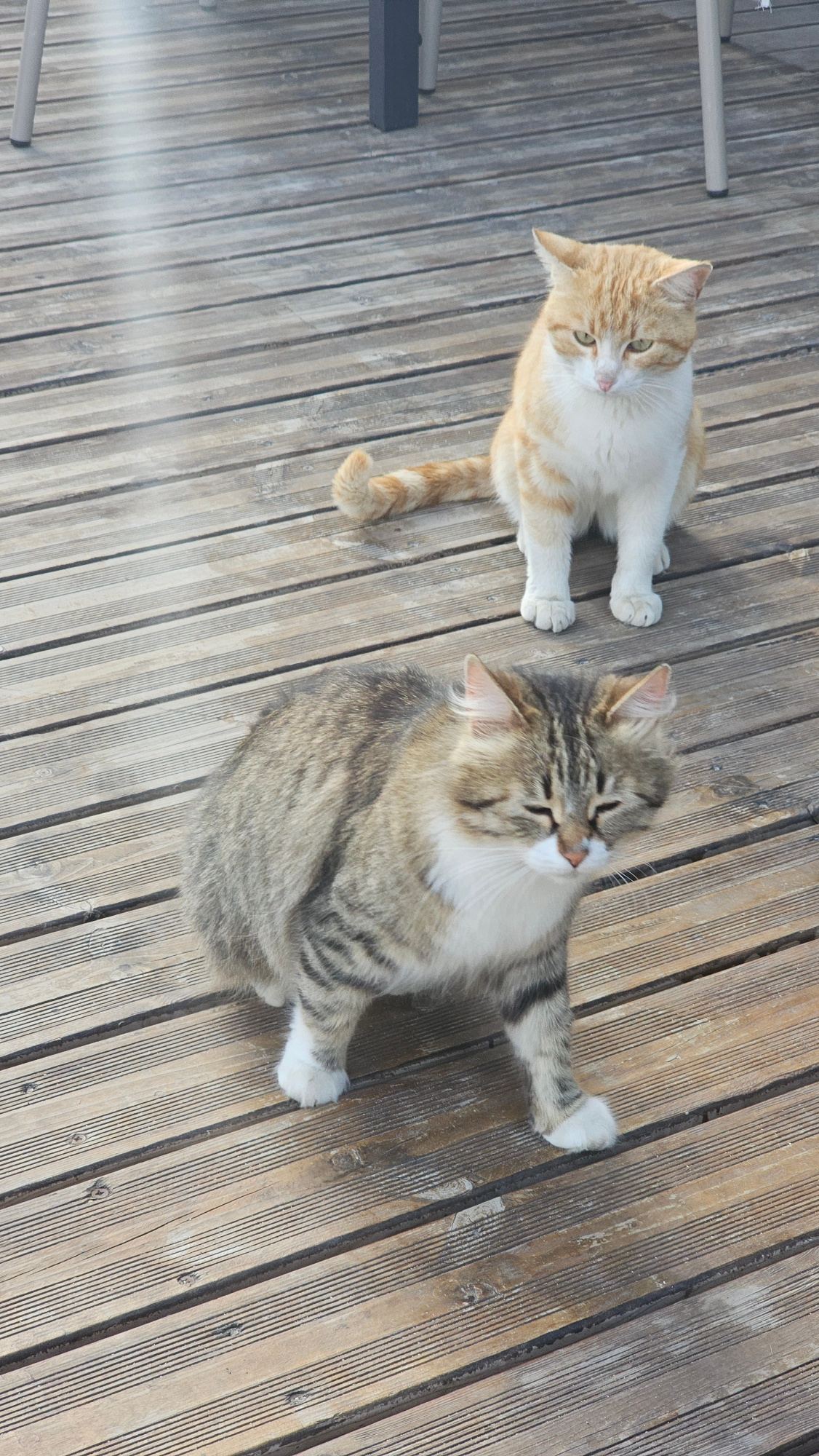 Two cats are resting outdoors on a light brown wooden deck, likely in Varna, Bulgaria. The image is taken from an overhead perspective, with a slight tilt. On the left, an orange and white tabby cat…read more