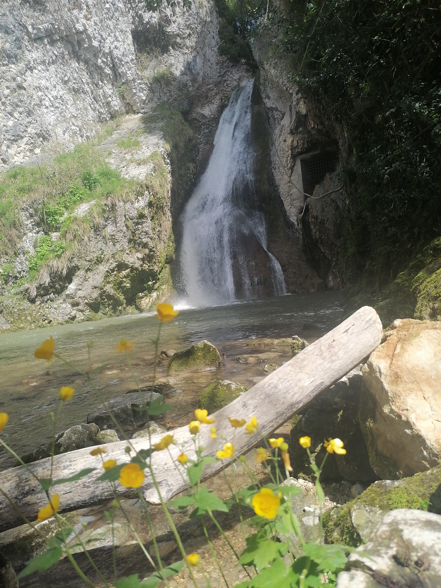 The image shows a waterfall in New Athos, Abkhazia. The waterfall cascades into a pool of water. In the foreground, there is a fallen log and yellow flowers. A rock face is on the left of the waterfal…read more