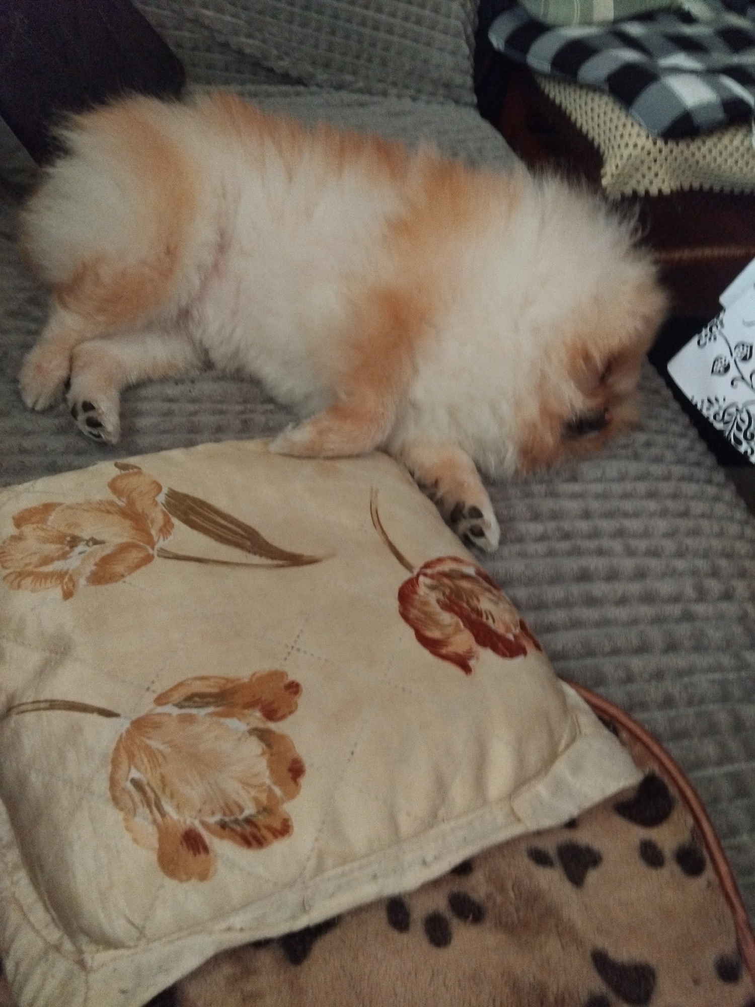 A tan and white Pomeranian dog is sleeping on a gray couch. The dog is lying on its side, with its paws curled. Next to the dog is a light-yellow pillow with floral patterns, and adjacent to that is a…read more