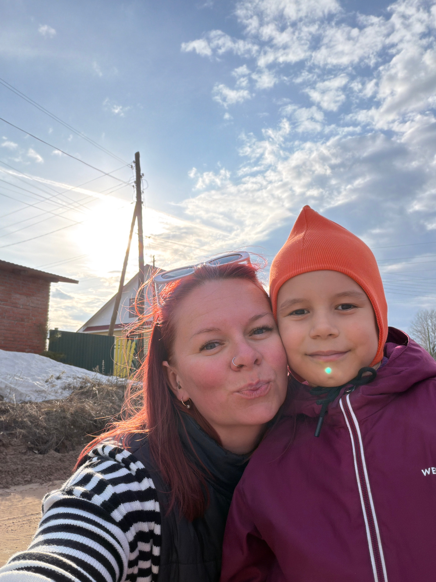 An image, rotated 90 degrees clockwise, captures a close-up selfie of an adult woman and a child outdoors in Chaikovsky, Russia. The woman, with reddish-brown hair and a nose piercing, is seen wearingβ¦read more