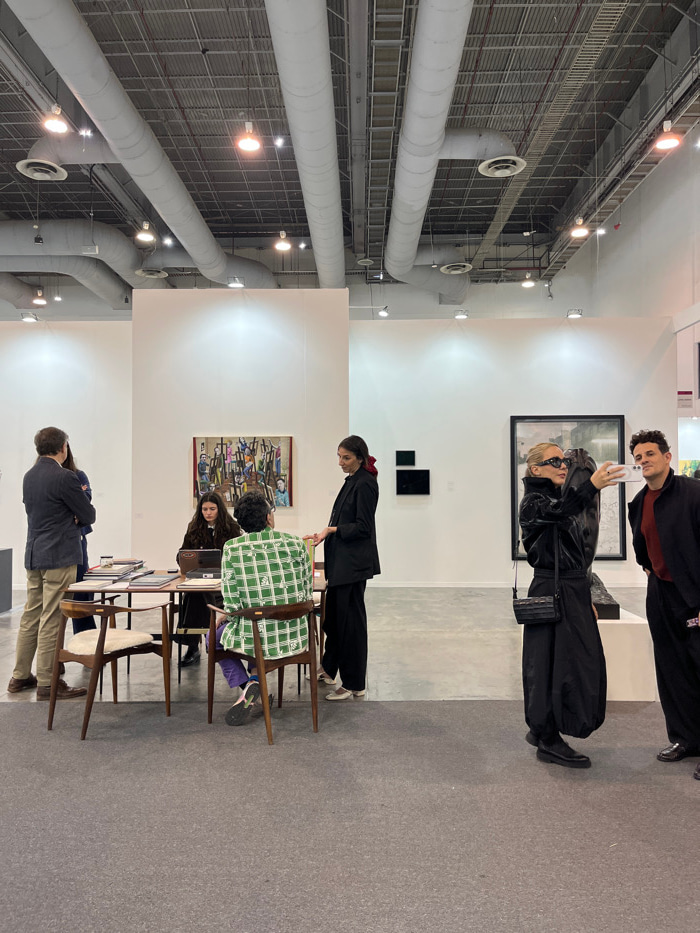Inside a spacious, modern gallery, patrons observe artwork hung on stark white walls. Some are seated at wooden tables with green checkered chairs, engrossed in laptops, while others stand to admire t…read more