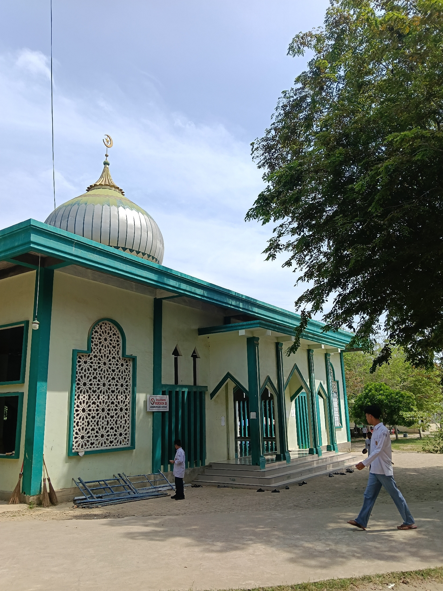 This image captures the exterior of a mosque on a bright, sunny day in Lhokseumawe, Indonesia. The building features light cream-colored walls contrasted with prominent teal or dark green trim, pillar…read more