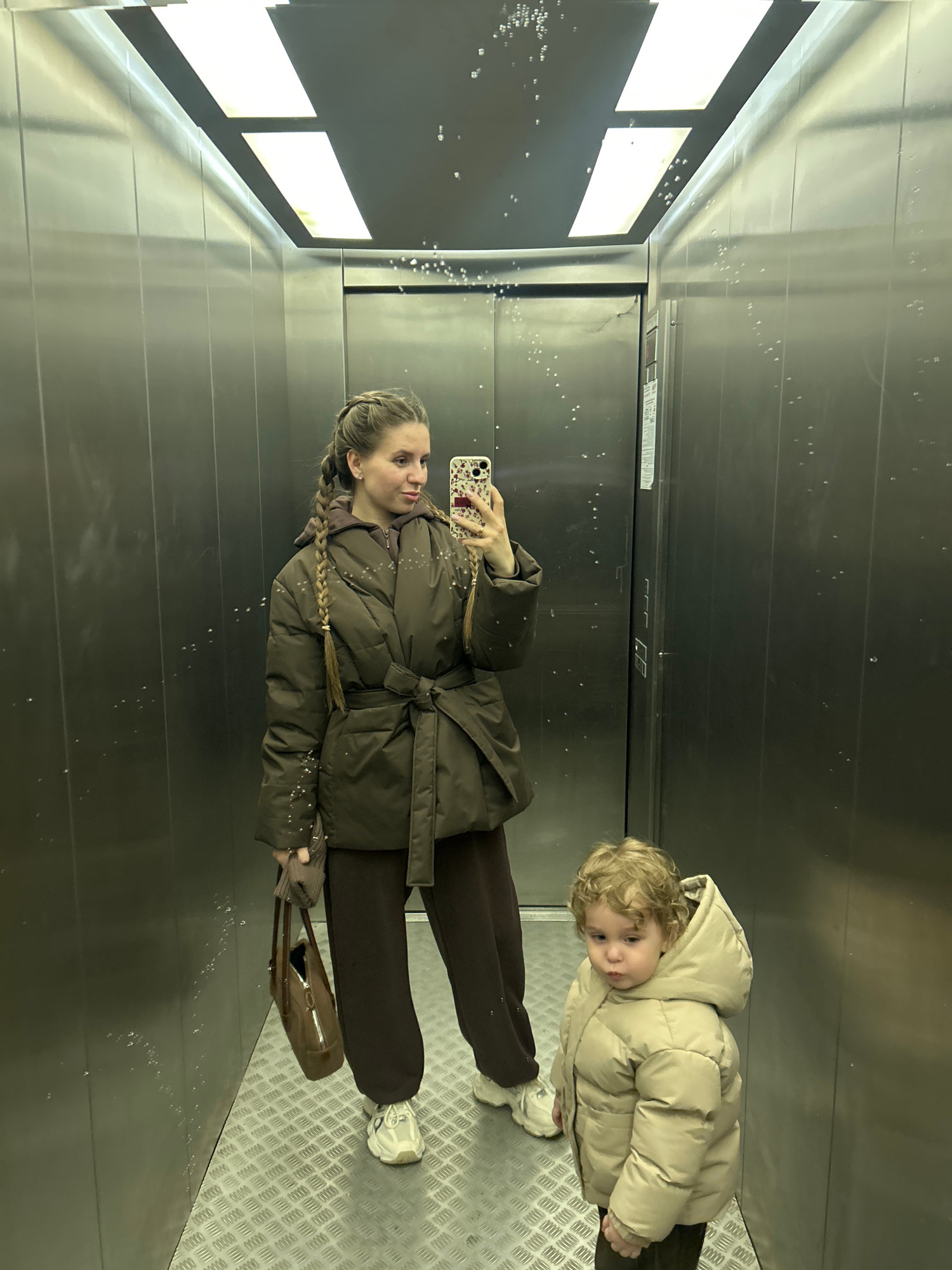 The image depicts a woman and a child taking a selfie in what appears to be an elevator with reflective metal walls. The woman, on the left side of the frame, is holding a smartphone and looking at it…read more