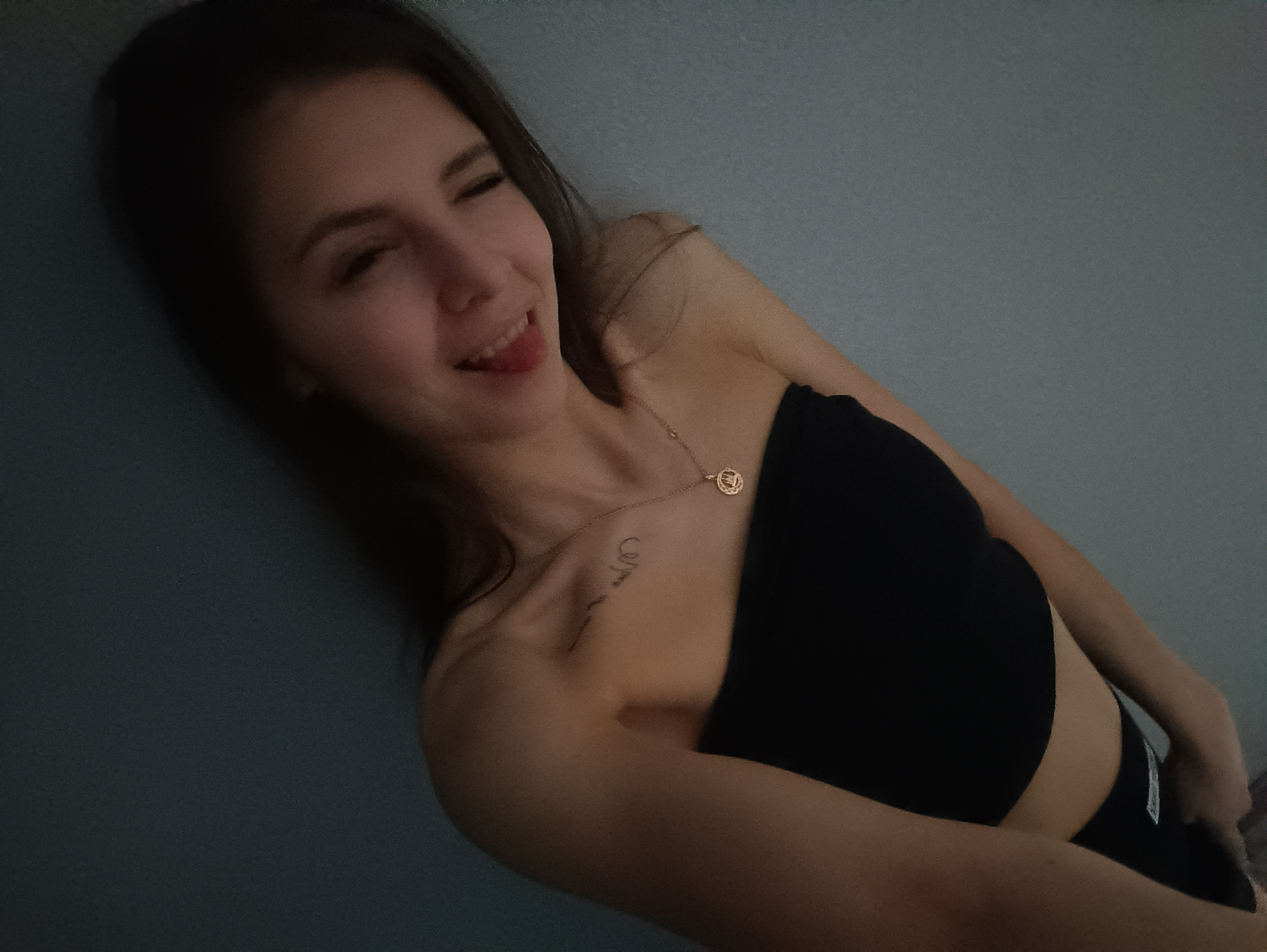 A woman lies against a bluish-gray wall. She is wearing a black tube top and black bottoms. She has a gold necklace with a circular pendant. A tattoo is visible on her upper chest/shoulder area. She i…read more