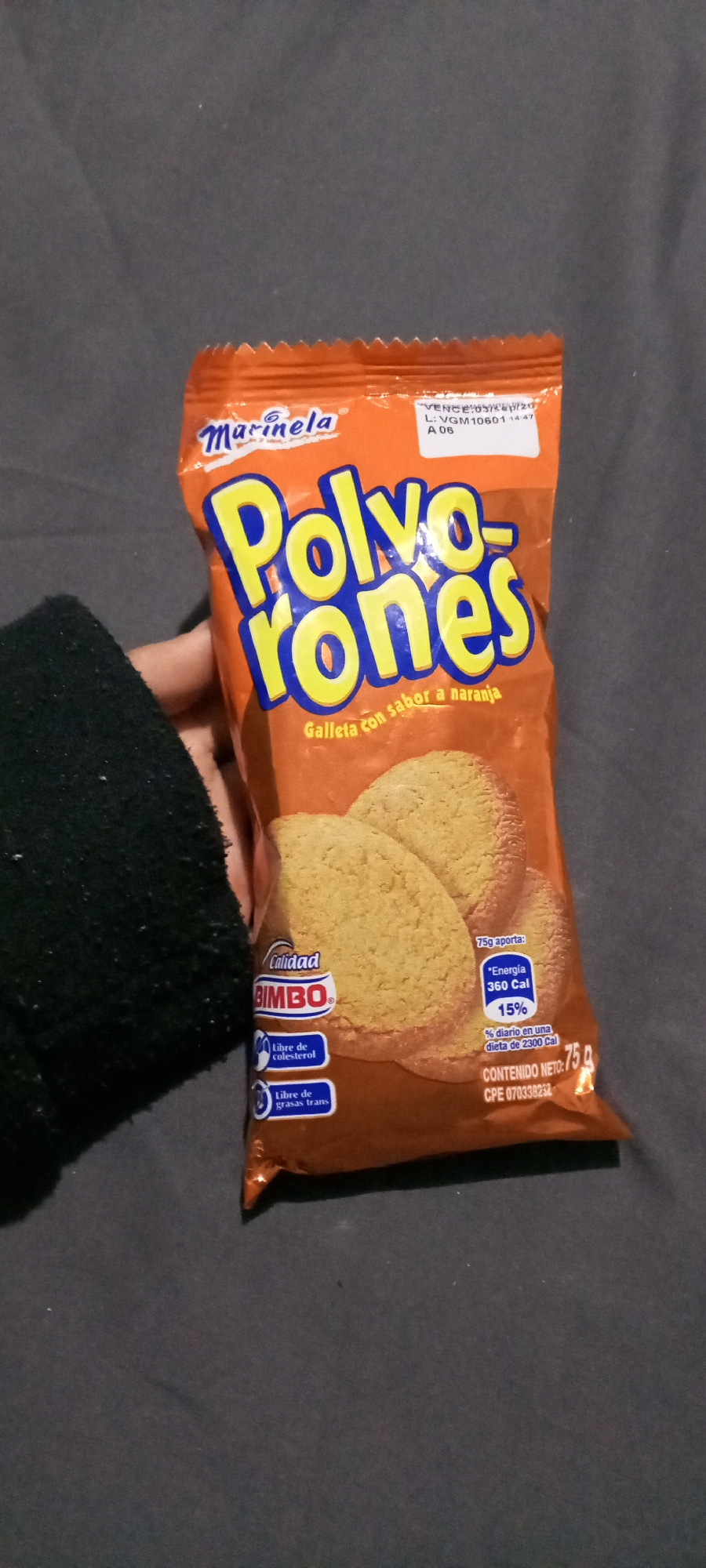 A package of Marinela Polvorones cookies is being held in someone's hand. The packaging is orange and features the brand name Marinela at the top, along with the product name "Polvorones" in large, bl…read more