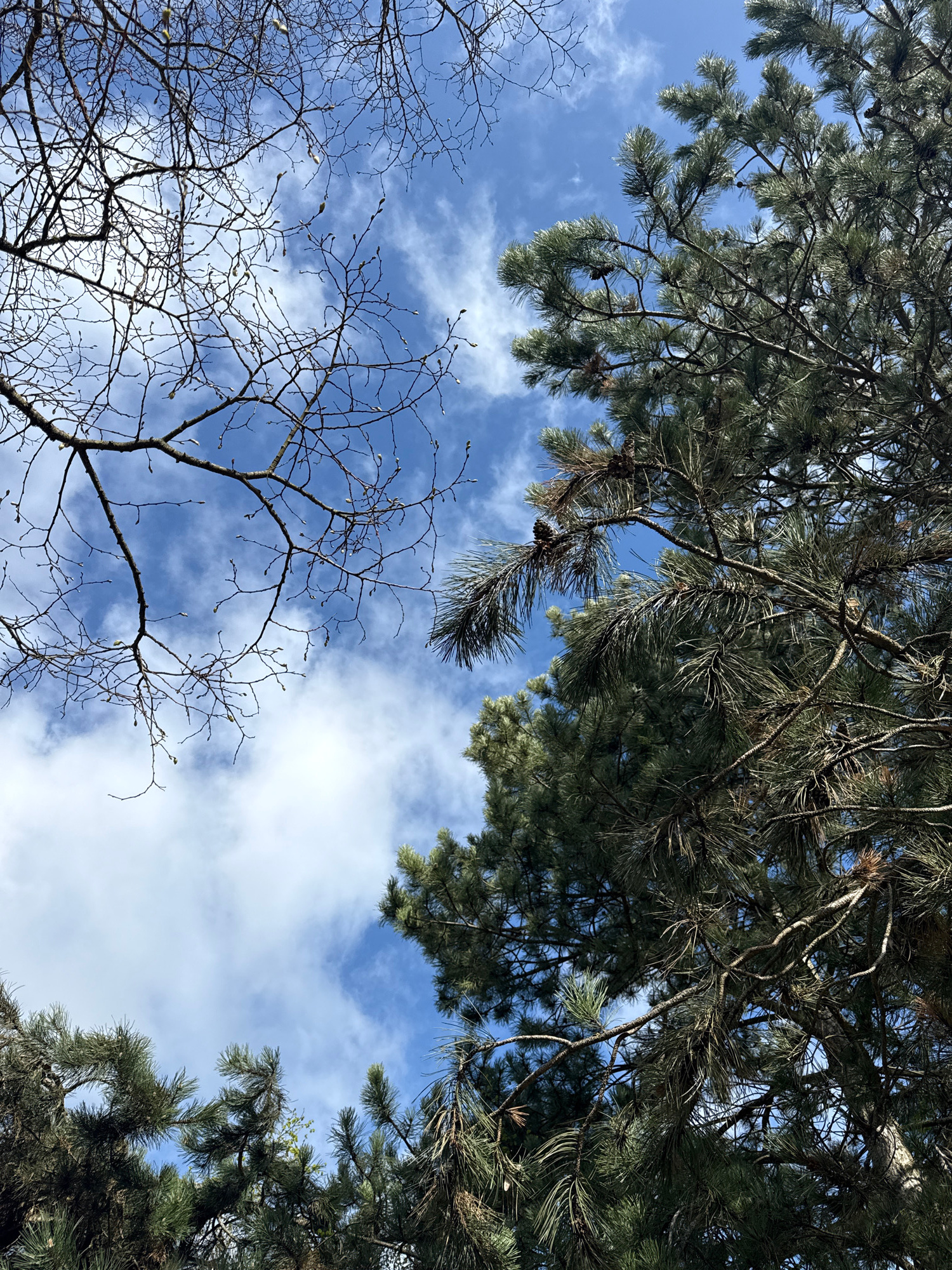 The image shows a view looking up through trees towards a blue sky with scattered white clouds. The branches of two types of trees are visible. The upper portion of the frame contains evergreen branch…read more