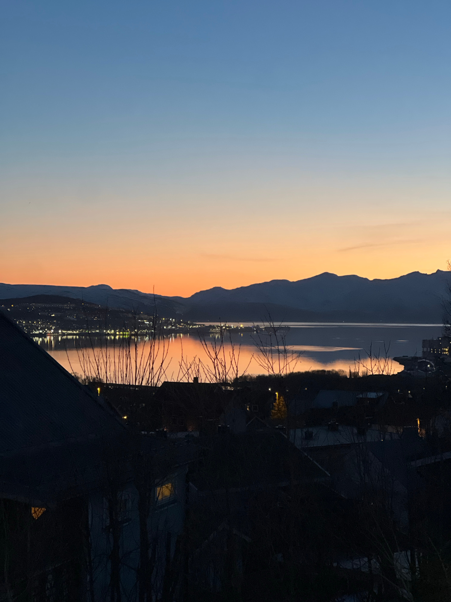 The image shows a view in Tromsø, Norway, at dusk or dawn. A fjord stretches between mountains, reflecting the orange-pink sky. City lights are visible along the waterfront. Silhouetted roofs and tree…read more
