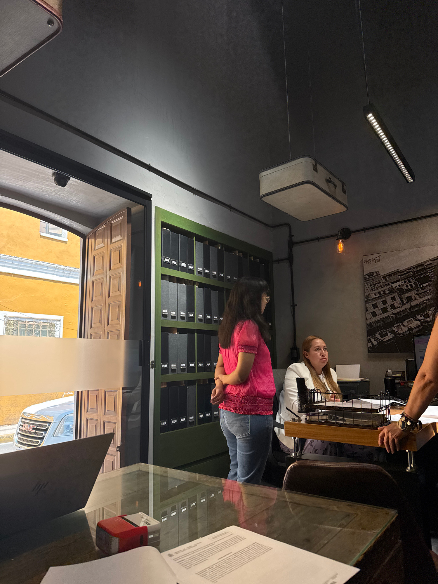 The image depicts an indoor scene, likely a cafe or shop, looking out onto a street in Apetatitlán, Mexico. The interior features a modern industrial design with dark grey walls and exposed conduits.…read more
