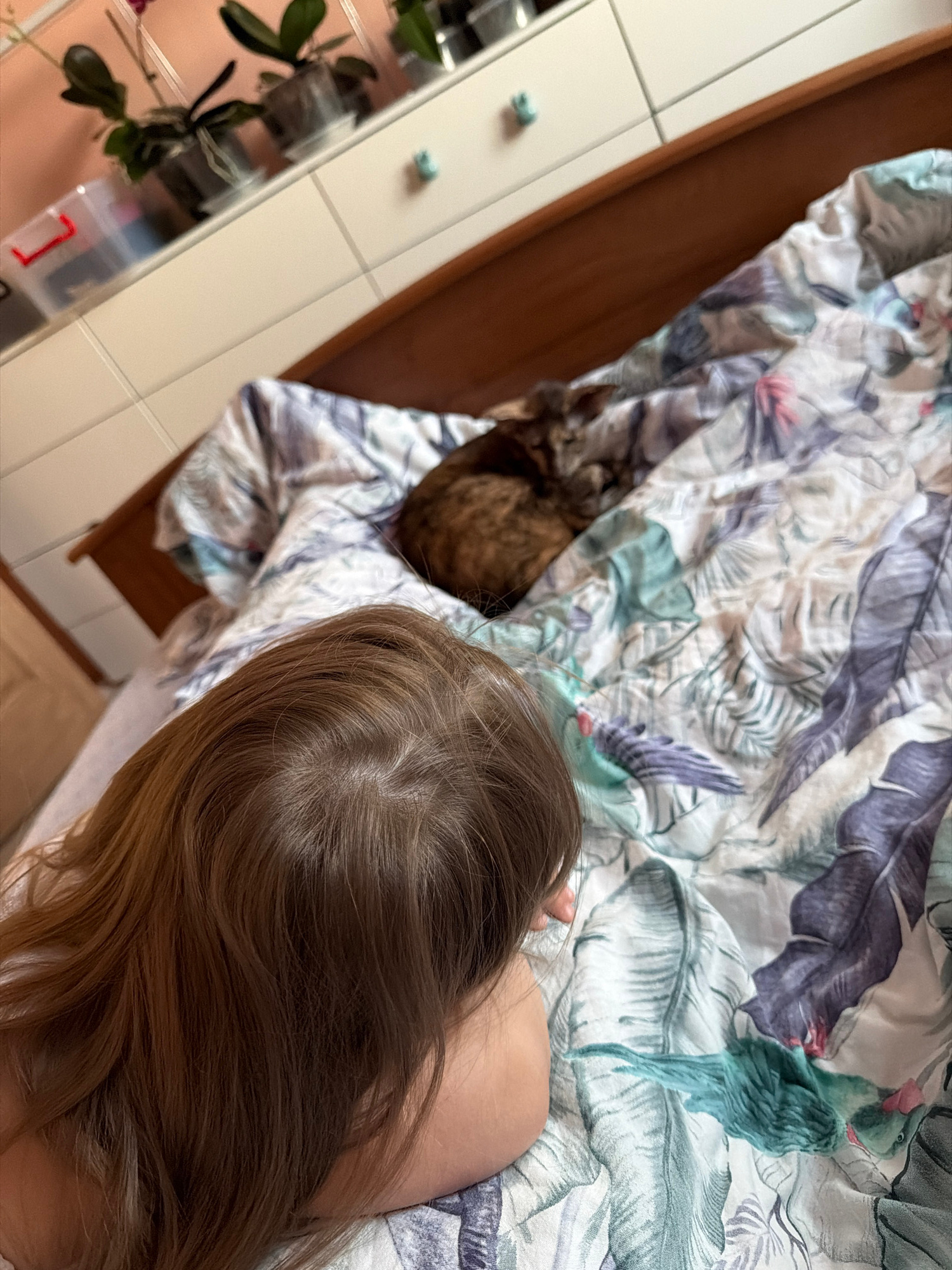 The image, taken in Chaikovsky, Russia, provides an overhead perspective of an indoor scene featuring a person and a cat resting on a bed. The central subject is the back of a person's head and should…read more