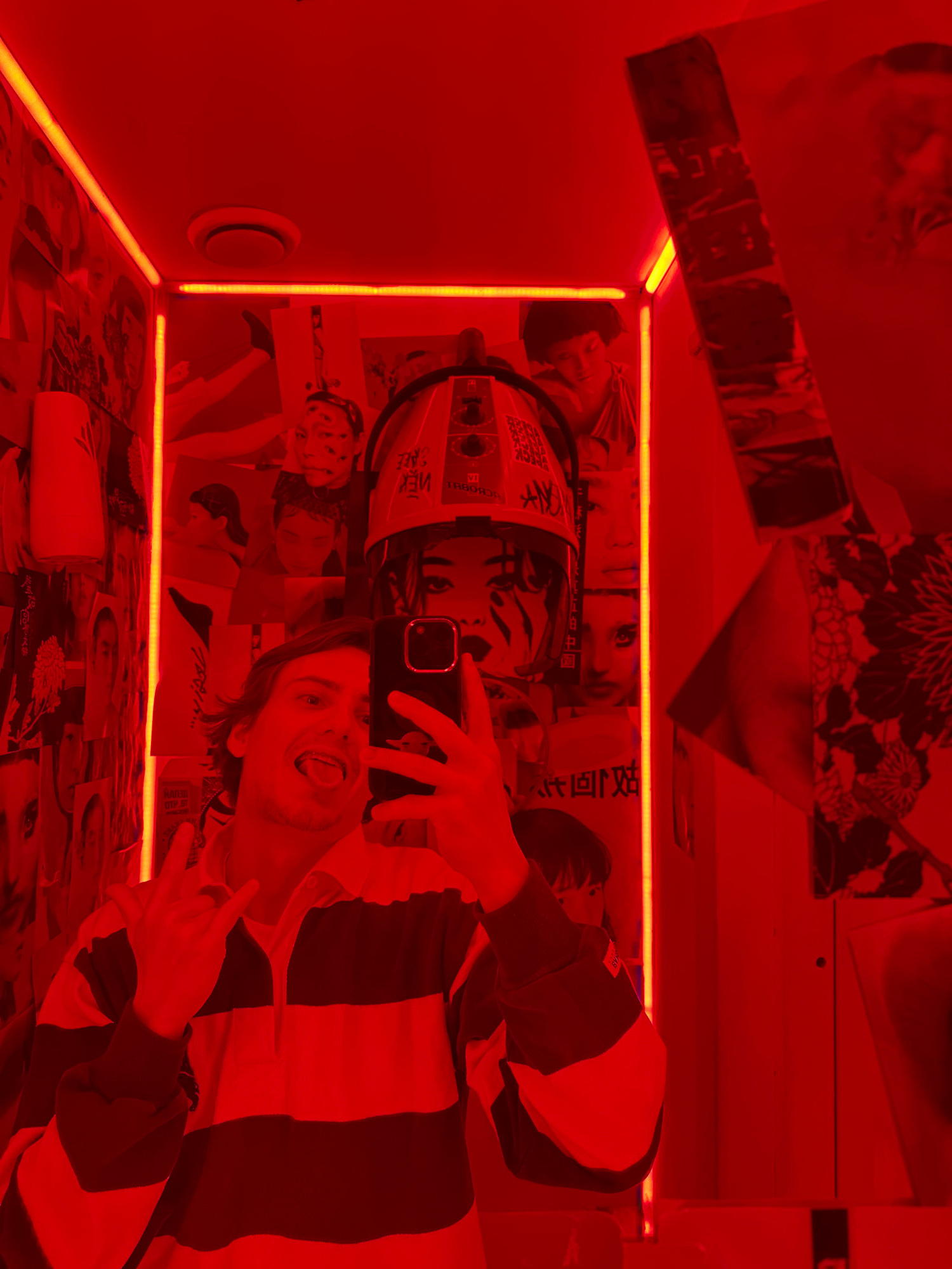 A man takes a selfie in a red photo booth. The interior is decorated with anime-style photos. The man is wearing a striped shirt and making a peace sign. This photo was taken in Moscow, Russia.