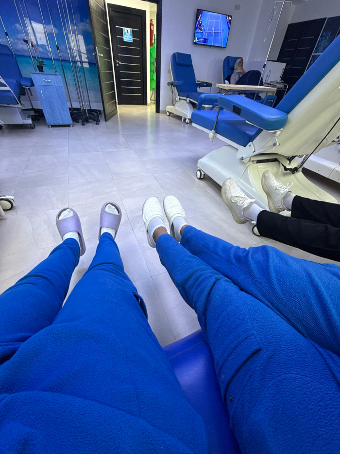 This image depicts the interior of a medical facility, possibly an infusion or dialysis center, located in Meknes, Morocco. The scene is captured from a low, first-person perspective, showcasing the e…read more
