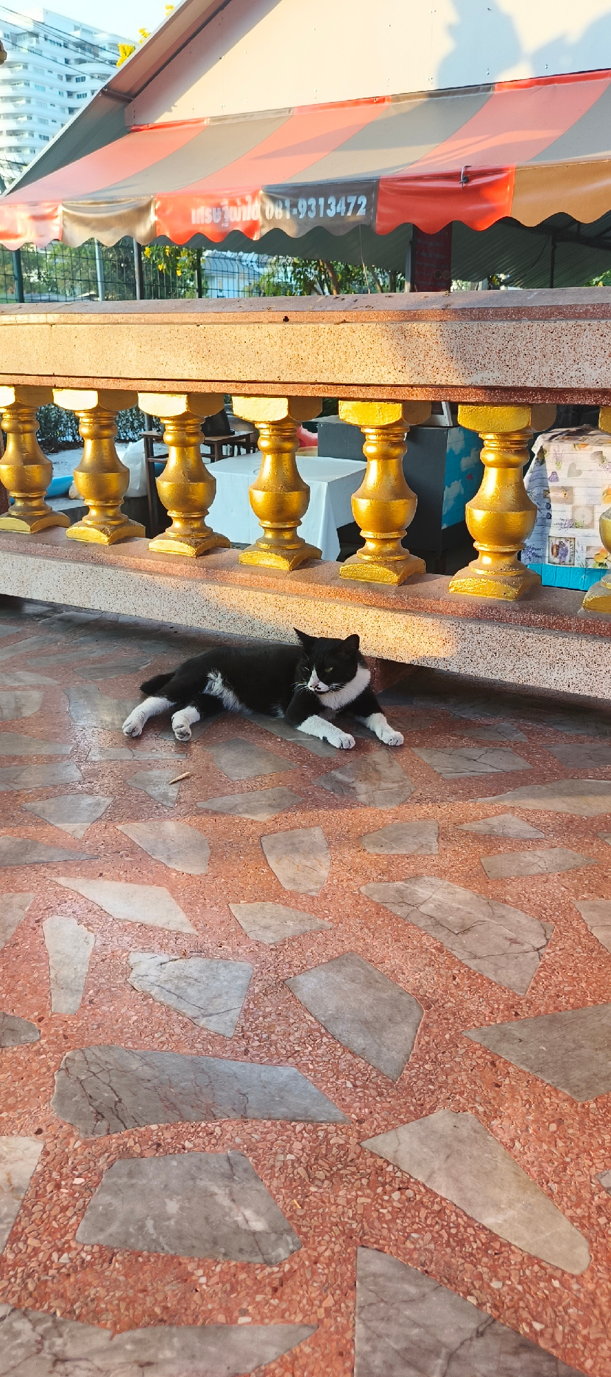 A black and white cat with distinctive markings, including a white muzzle, chest, and paws, is seen resting on a patterned floor. The cat lies stretched out on its side, appearing calm and relaxed. Th…read more