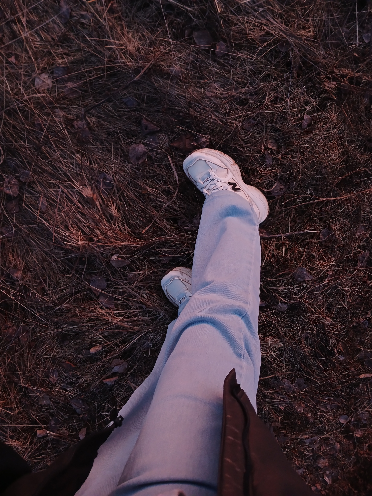 This image presents a low-angle, top-down view of a person's legs and feet set against a natural, outdoor backdrop. The individual is wearing light-wash blue jeans and white athletic sneakers. A promi…read more